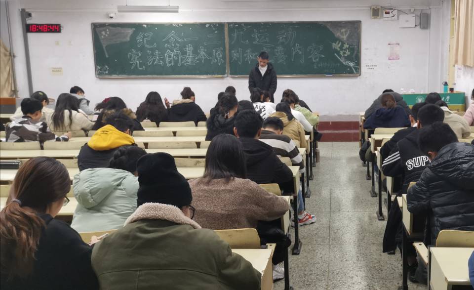 12月8日,beat365在线体育官网在教学区开展“纪念一二九运动”和“宪法的基本原则和主要内容”主题政治学习。2018级、2019级全体学生参与学习。