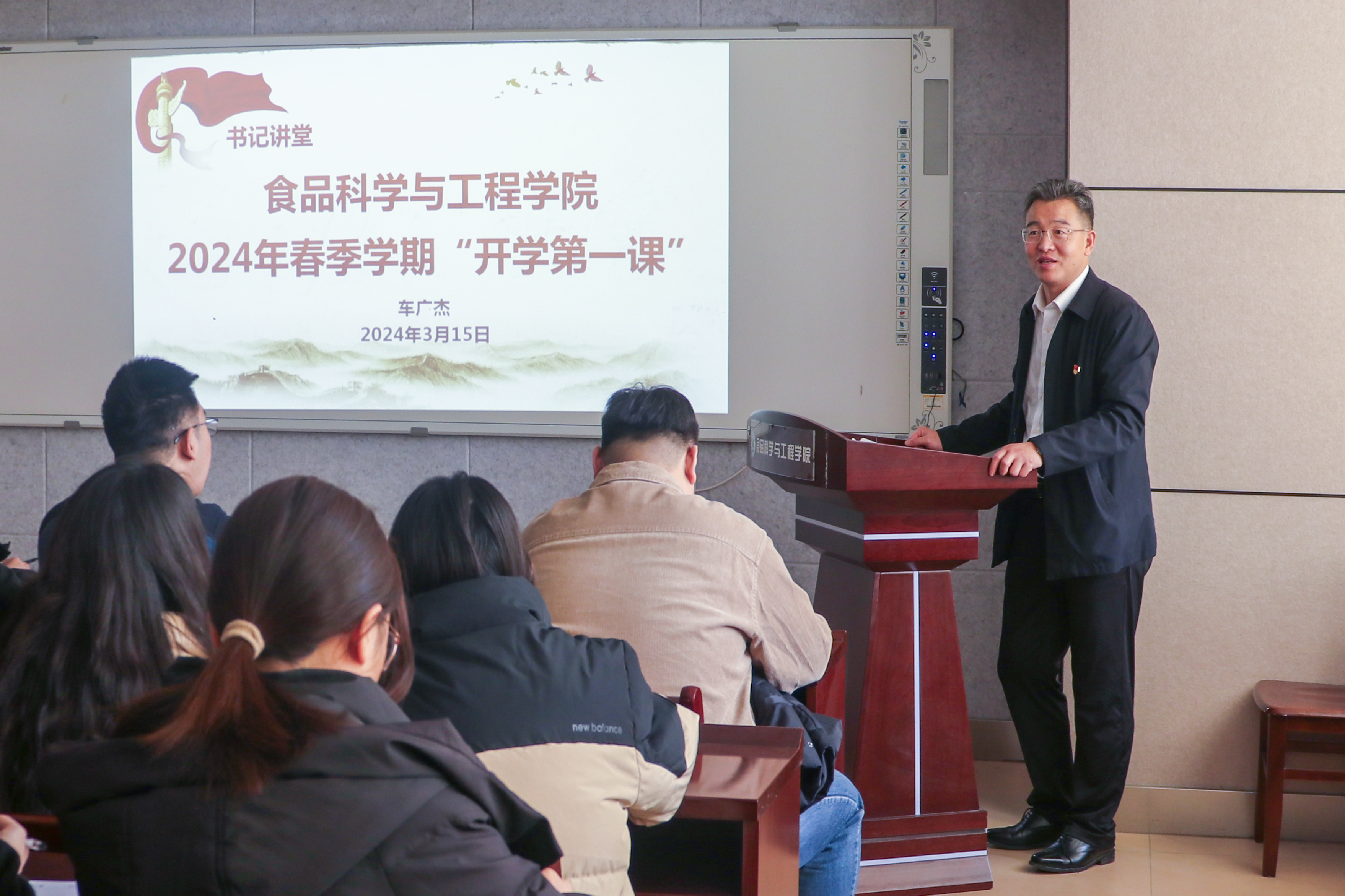 为加强基层党组织建设,发挥党员先锋模范作用,引导广大学生党员坚定理想信念,学习好宣传好贯彻好2024年全国两会精神。3月15日,beat365在线体育官网举办2024年“食”代先锋书记讲堂第一讲,学院党委书记车广杰为学生党员上“开学第一课”。