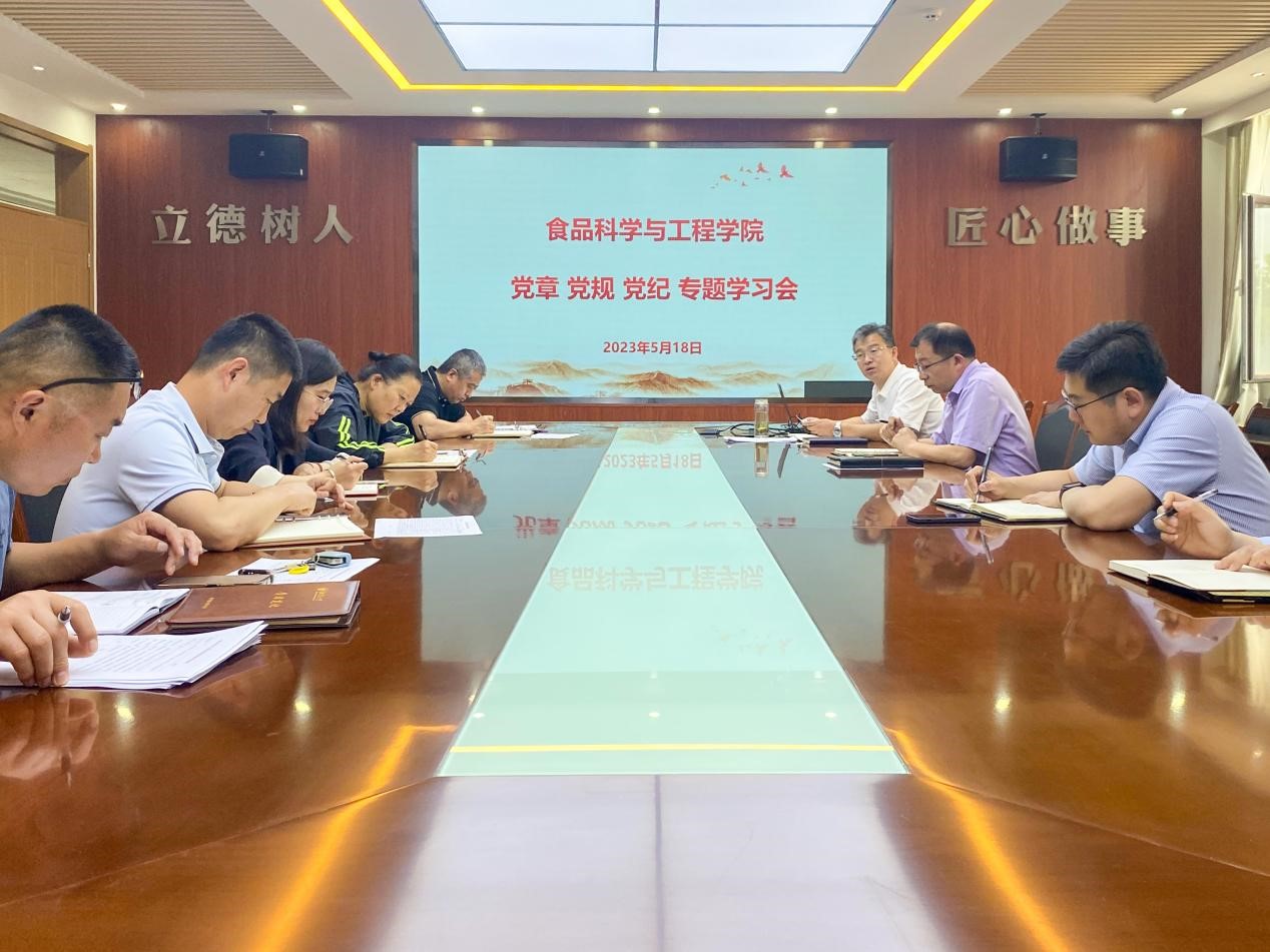 5月18日,beat365在线体育官网组织学院党委委员、党支部书记、科级干部和辅导员,在食品楼310召开党章党规党纪专题学习会议,会议由党委书记车广杰主持。