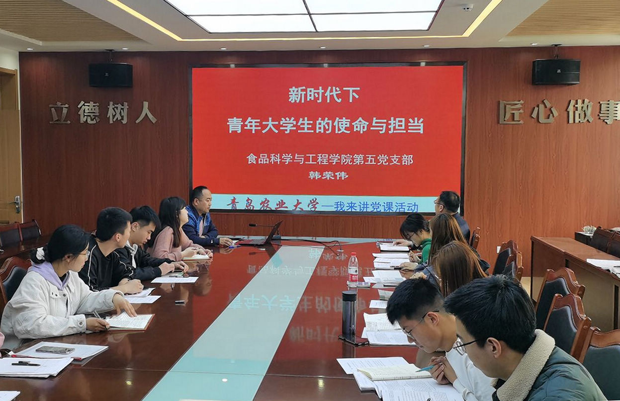 3月18日,beat365在线体育官网副教授、第五党支部组织委员韩荣伟于食品楼会议室为学院全体党员、入党积极分子作题为“新时代下青年大学生的自信与担当”的专题党课辅导报告。报告会由食品学院党委委员、第五党支部书记李永青主持。