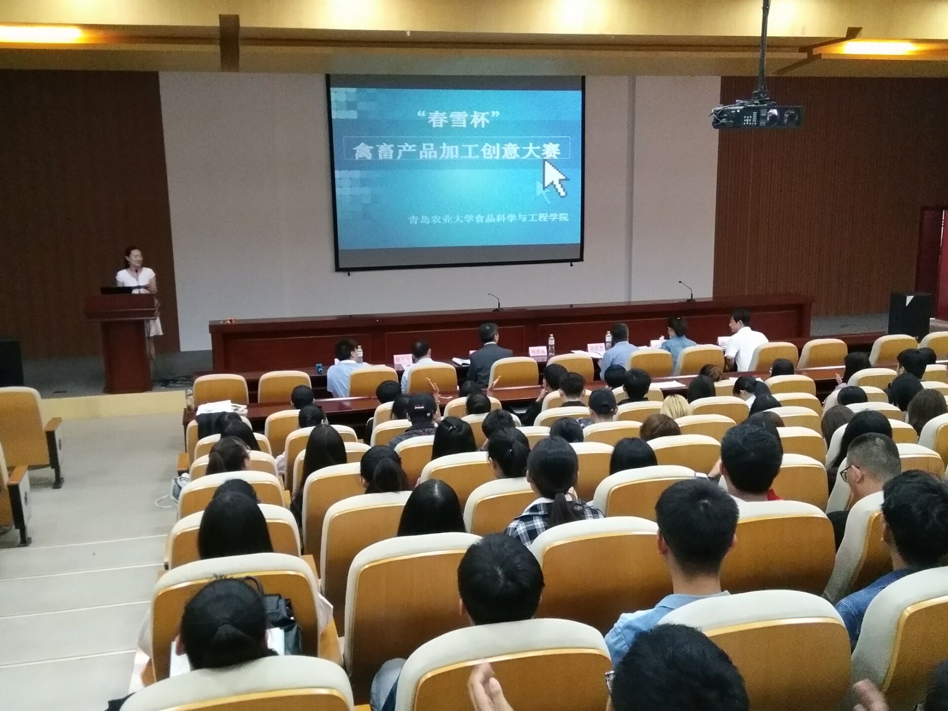 9月29日上午,beat365在线体育官网联合山东春雪食品有限公司共同举办的“春雪杯”禽畜产品加工创意大赛在学术会馆第二报告厅举行。山东春雪食品有限公司研发部徐建祥博士,食品学院党委书记何忠诚、院长王宝维、党委副书记宋伟、副院长孙庆杰、团委书记李永青、生物工程专业负责人谭海刚、农产品加工教研室主任吴昊、葡萄与葡萄酒工程专业负责人程凡升出席大赛并担任评委。