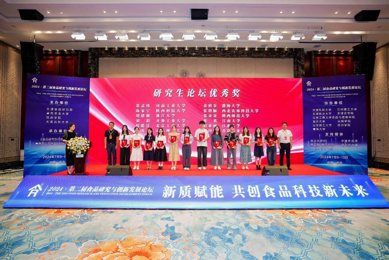 论坛上,天津食品集团党委委员、副总经理毕国生,渤海大学党委副书记刘贺为《食品研究与开发》优秀青年编委颁发荣誉证书,皖西学院党委副书记、校长黄友锐,中国海洋大学教授牟海津为12位研究生颁发“2024•第二届食品研究与创新发展论坛”研究生论坛优秀奖。我校吴薇教授和研究生周玲玲分别获奖。