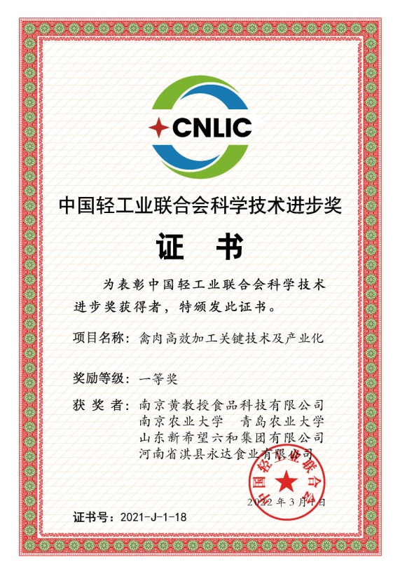 中国轻工业联合会科学技术进步奖是由中国轻工业联合会设立的最高轻工科技奖项,属于国家部级科技奖励,被认为是轻工业的“荣誉勋章”。“禽肉高效加工关键技术及产业化”项目,由南京黄教授食品科技有限公司董事长黄明主持,孙京新教授作为第二位人选参与,我校与南京农业大学、山东新希望六和集团有限公司、河南省淇县永达食业有限公司共同参与完成。