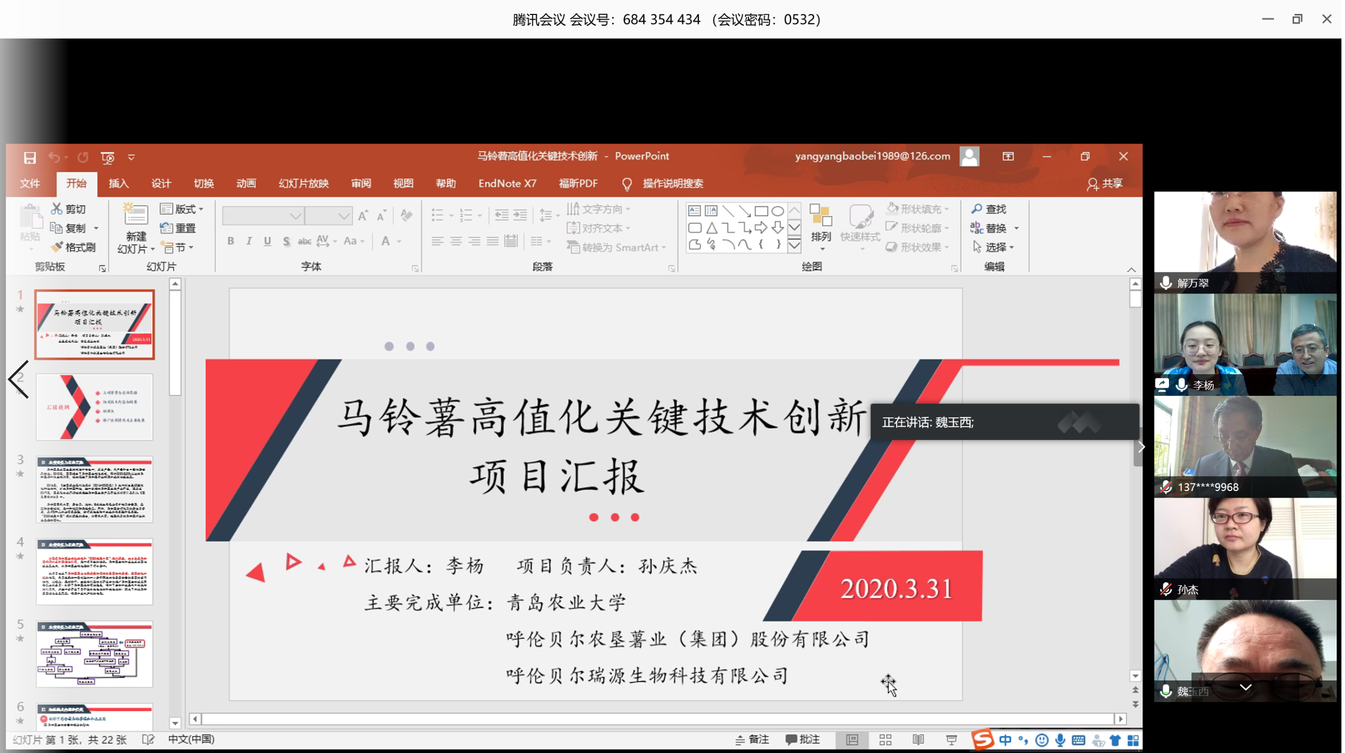 为促进马铃薯产业不断创新和发展,合理评价食品科技成果的质量和水平,加快食品科技成果的推广应用,3月31日,青岛食品科学技术学会组织相关专家对青岛农业大学等单位完成的“马铃薯高值化关键技术创新”成果进行了会议评价。青岛市食品科学技术学会理事长王宝维教授主持了本次科技成果评价工作。邀请中国海洋大学林洪教授、青岛大学魏玉西教授、青岛科技大学解万翠教授、中国科学院青岛生物能源与过程研究所李朝旭研究员以及山东省农科院花生研究所孙杰研究员等5位专家组成评价专家组。