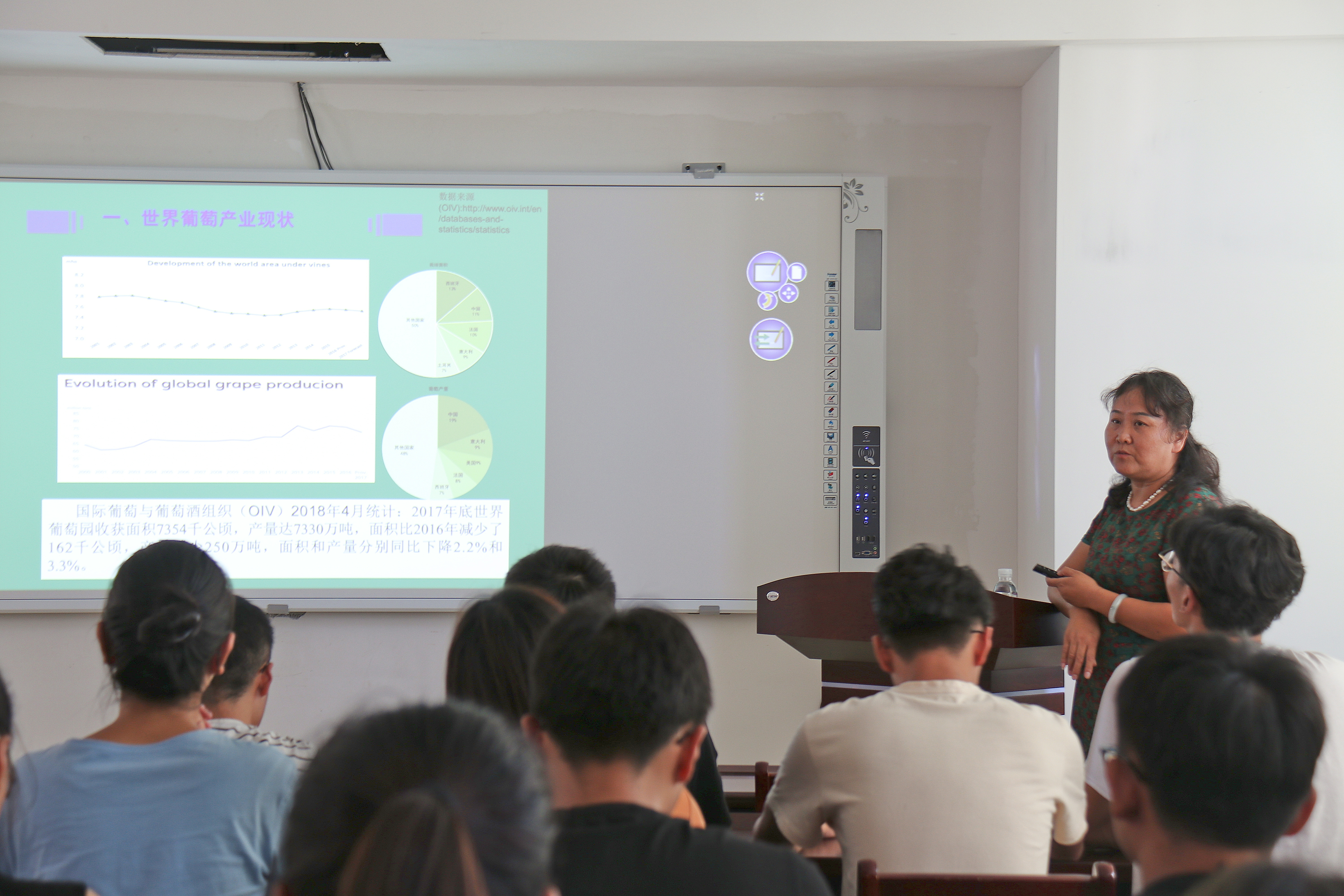 报告会上,田淑芬从国外葡萄产业发展、我国葡萄产业发展现状和新形势下我国葡萄产业发展方向三个方面进行讲解,并通过近年来国内外葡萄酒产量及消费情况的对比,向同学们展示了葡萄在新品种、种植、贮存等方面技术的提升。田淑芬以澳大利亚、美国等国家的酒庄联盟和四川杨志明大学生创业种植的“美人指”葡萄为例,深入浅出地讲解了葡萄精致化管理的优质高效生产模式及现代农业发展理念。她鼓励在场学生努力学习葡萄与葡萄酒文化,加大品牌宣传,为中国葡萄产业的发展不断注入新生力量。