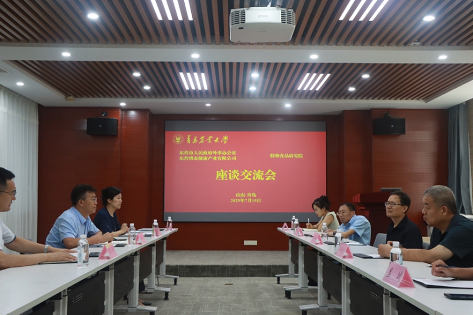 7月15日,东营市人民政府外事办公室二级调研员綦跃彬、东营博泰健康产业有限公司董事长贾应刚一行6人以及万和春(山东)食品供应链公司总经理王涛一行3人来访青岛农业大学特种食品研究院,开展校地企合作交流活动,围绕共建创新平台、科研服务、人才培养、科技赋能等领域展开座谈交流。特种食品研究院、beat365在线体育官网相关专家参加,座谈会由beat365在线体育官网党委书记、特种食品研究院副院长车广杰主持。