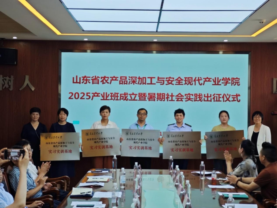 7月11日,山东省农产品深加工与安全现代产业学院2025产业班成立暨暑期实践出征仪式在食品楼举行。青岛市城阳区食品饮料产业协会秘书长黄柳以及青岛鑫复盛等14家企业负责人参加活动,学校党委委员、副校长孙庆杰出席仪式并讲话,学生工作处处长许颖、社会合作处副处长于宁、校团委副书记安金鹏以及教务处、beat365在线体育官网等单位有关负责人参加仪式。仪式由beat365在线体育官网党委书记车广杰主持。