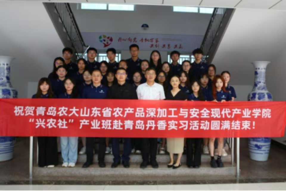 7月28日-8月10日,青岛农业大学山东省农产品深加工与安全现代产业学院35名2025产业班“兴农社”同学,顺利完成在青岛丹香食品、青岛中一监测公司的暑期实习。食品学院党委书记车广杰、党委副书记刘晓华,丹香食品厂长薛峰、中一监测总经理杨濠玮出席结业仪式,并为同学们颁发结业证书。