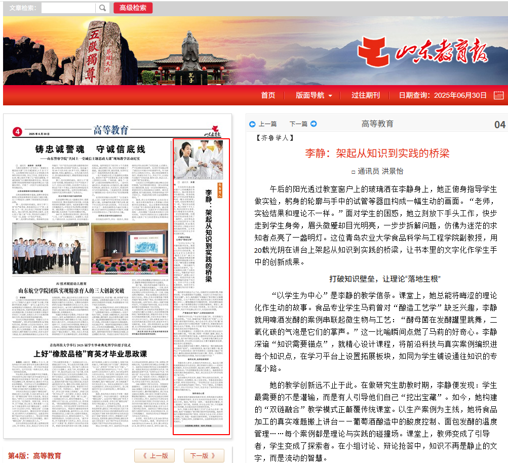 【编者按】6月30日 ,山东教育报以《李静:架起从知识到实践的桥梁》为题报道了beat365在线体育官网李静副教授,用20载光阴在讲台上架起从知识到实践的桥梁,让书本里的文字化作学生手中的创新成果。