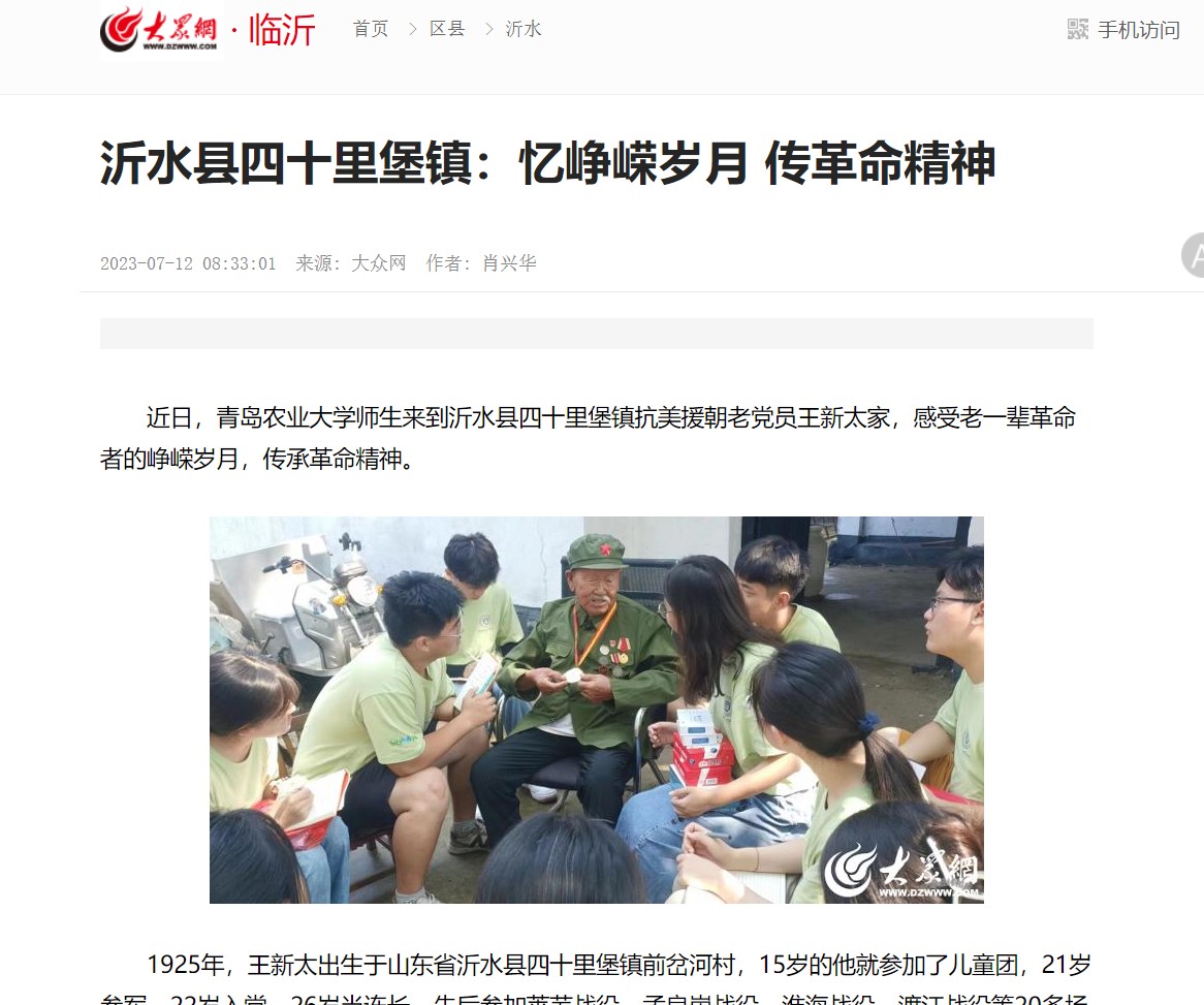 近日,青岛农业大学师生来到沂水县四十里堡镇抗美援朝老党员王新太家,感受老一辈革命者的峥嵘岁月,传承革命精神。