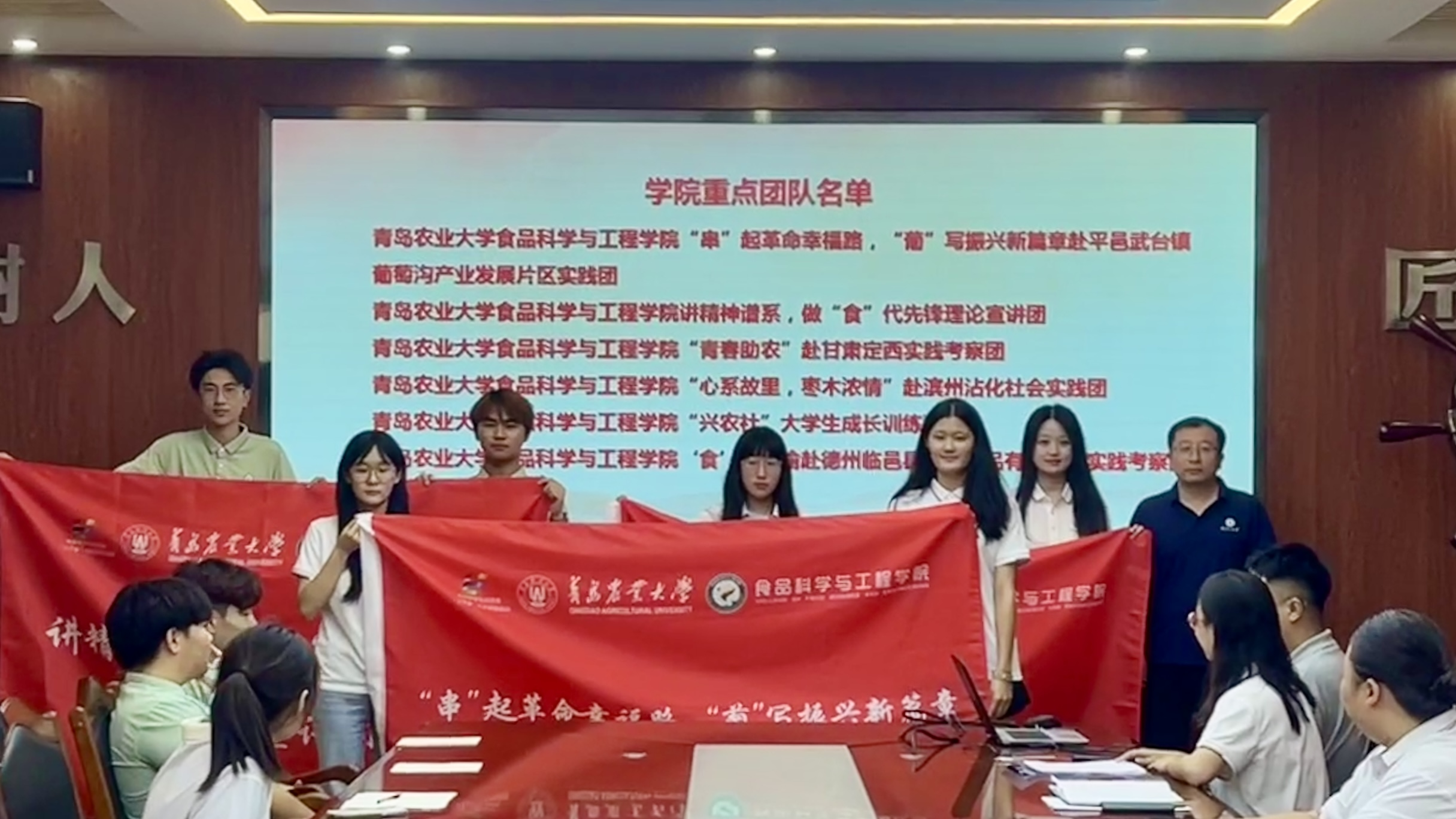 仪式上,刘晓华为各实践团队授旗。据统计,今年暑期食品学院共组织了20余支社会实践团队以及20余人投入个人实践,其中包括校级团队1支、院级重点实践专项团队6支,参与社会实践总人数共计163人。共计50余名同学将经过“青鸟计划”的层层选拔,进入到家乡的机关、企事业单位实习,感知山东、提高认识和融入社会的素质能力。