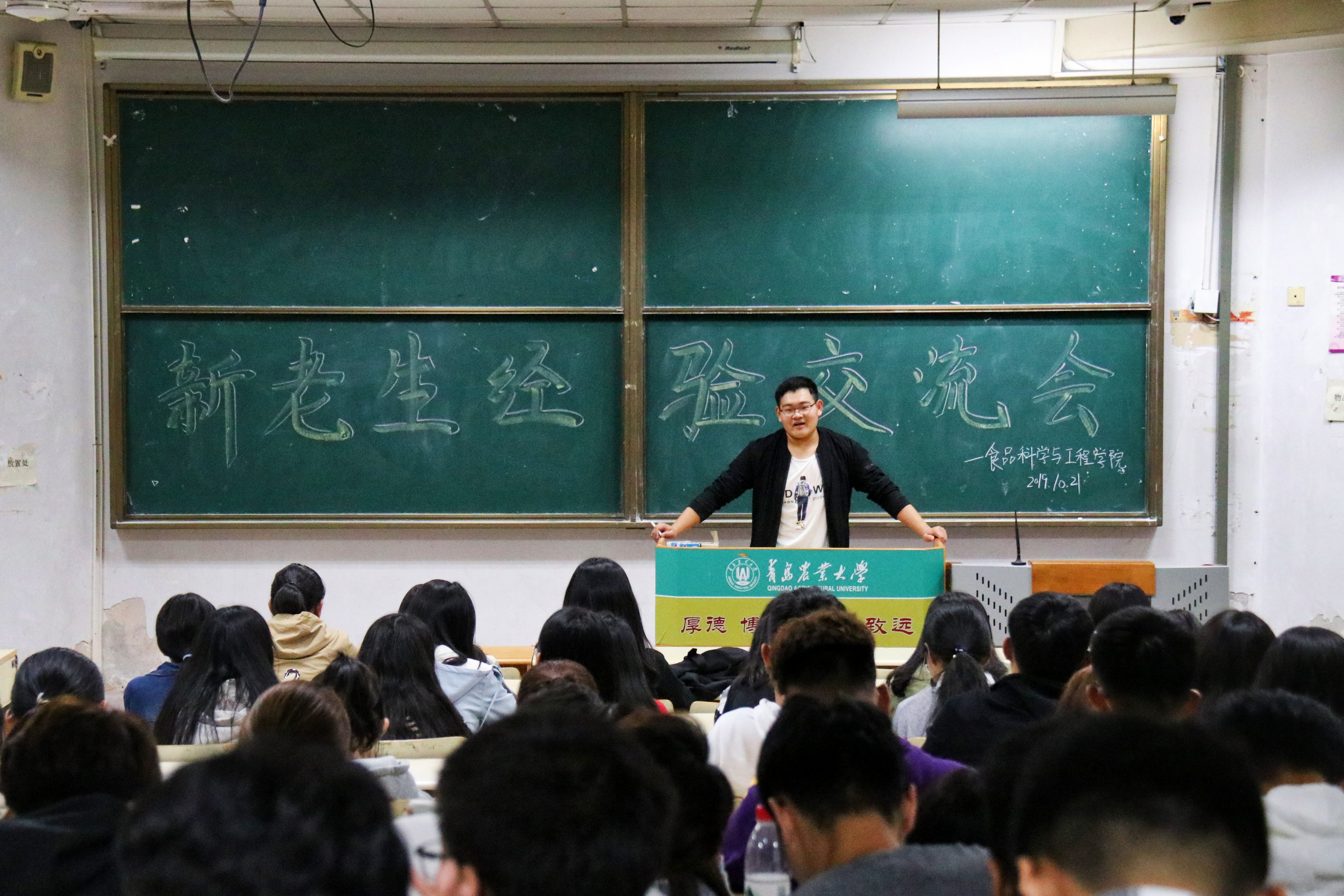 会上,2017级学生代表分享了自己大学生活的经验。食科1703班赵文晴介绍了食品科学与工程专业未来的就业情况、考研率以及毕业去向,对于如何安排课余生活提出了自己的建议,并且鼓励同学们努力学习,争取拿奖学金。质检1703班孙海涛向2019级新生分享了三点学习经验:一要认真听课,善于总结。课堂上,记好笔记和例题,及时总结、吸取经验教训。二要及时复习,大学是考验一个人自律能力的地方,由于课程较难,及时复习和巩固特别重要,最好临考试5周前便开始复习。三要注重答题策略,做题技巧,找到各自的答题策略,才能应付自如。对于学生干部工作,质检1701班苑祥昊建议同学们严于律己,做好自己本职工作,避免功利性;提升学习成绩,带动班级学风和班级氛围。