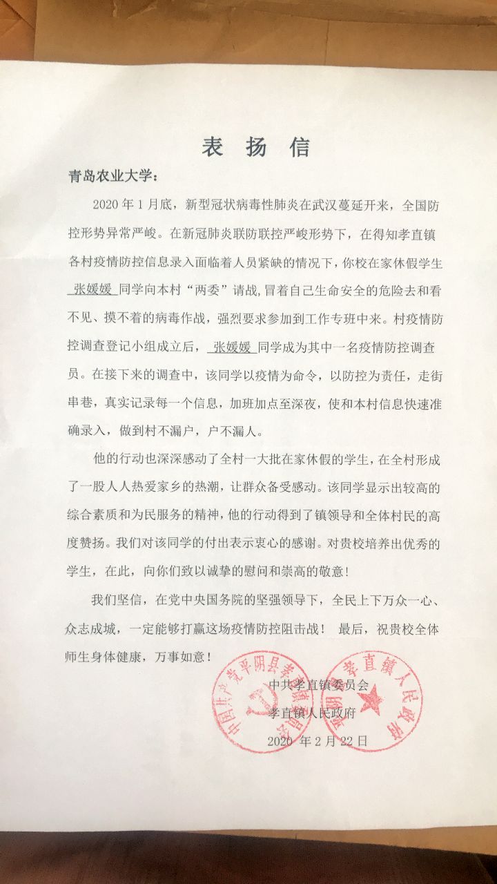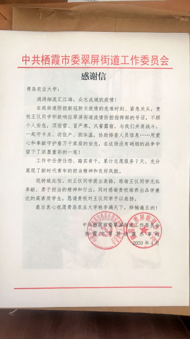 近日,beat365在线体育官网陆续收到参与疫情防控志愿服务同学所在地的表扬信、感谢信、感谢函等文件,对食品学子在此次新冠肺炎疫情防控期间积极参与地区疫情防控工作表示表扬和感谢。