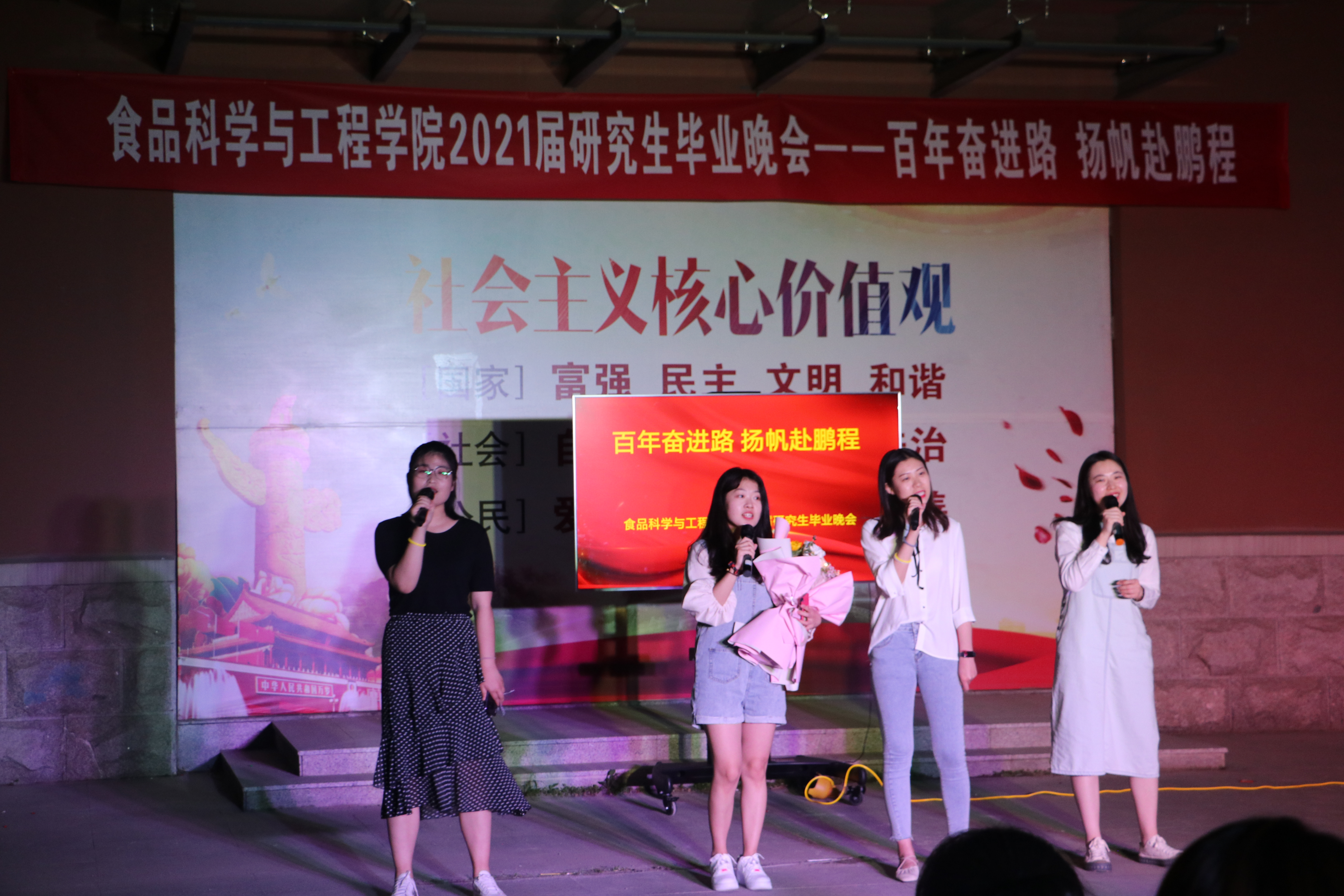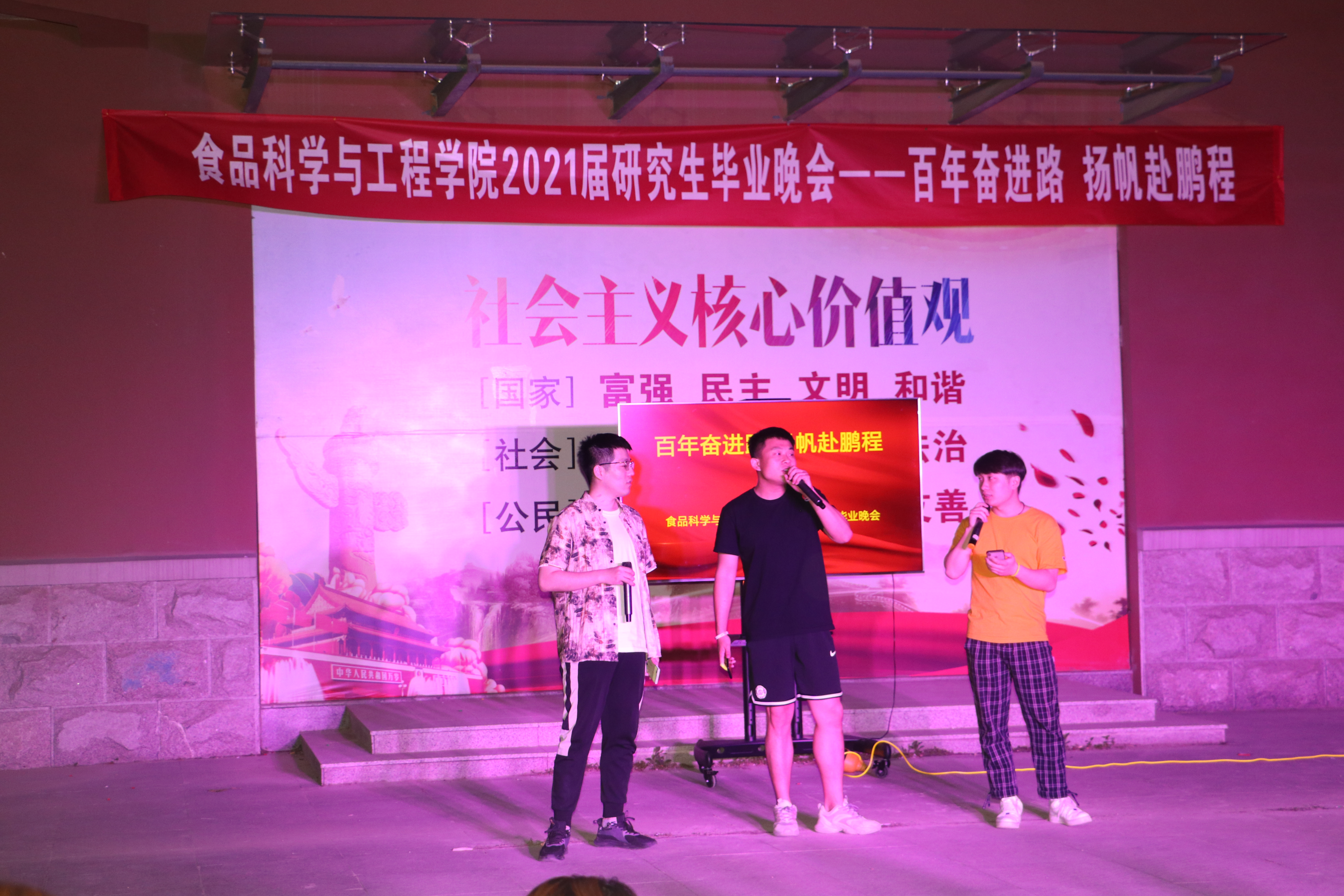 6月6日,beat365在线体育官网于食品楼小广场举办“百年奋进路,扬帆赴鹏程” 2021届研究生毕业晚会。食品学院辅导员、全体研究生共同观看了晚会。