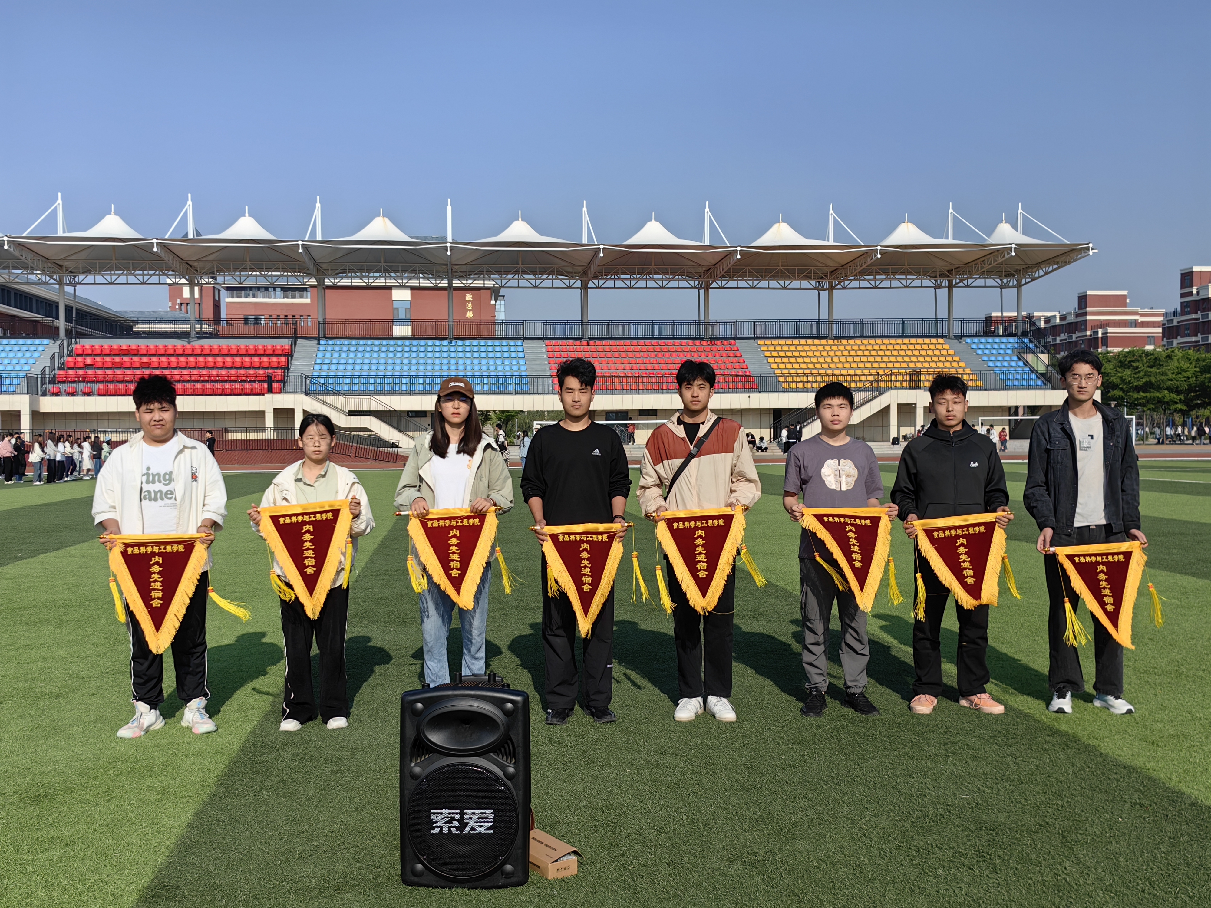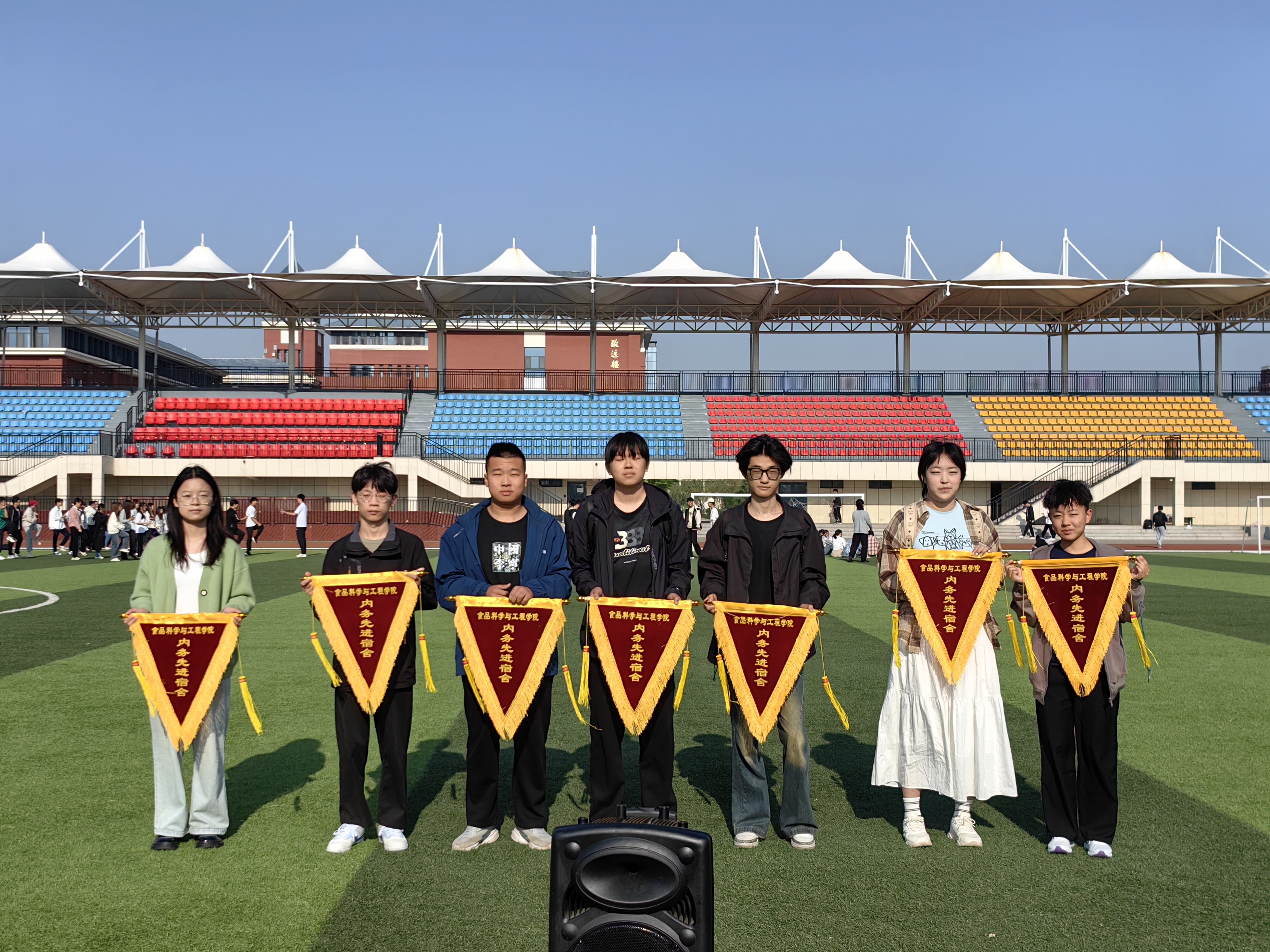 5月9日,食品学院开展公寓安全隐患大排查暨卫生大扫除流动红旗评比表彰活动,辅导员于晓涵在平度校区东苑朝阳操场为获得“优秀内务”的宿舍授予流动红旗。