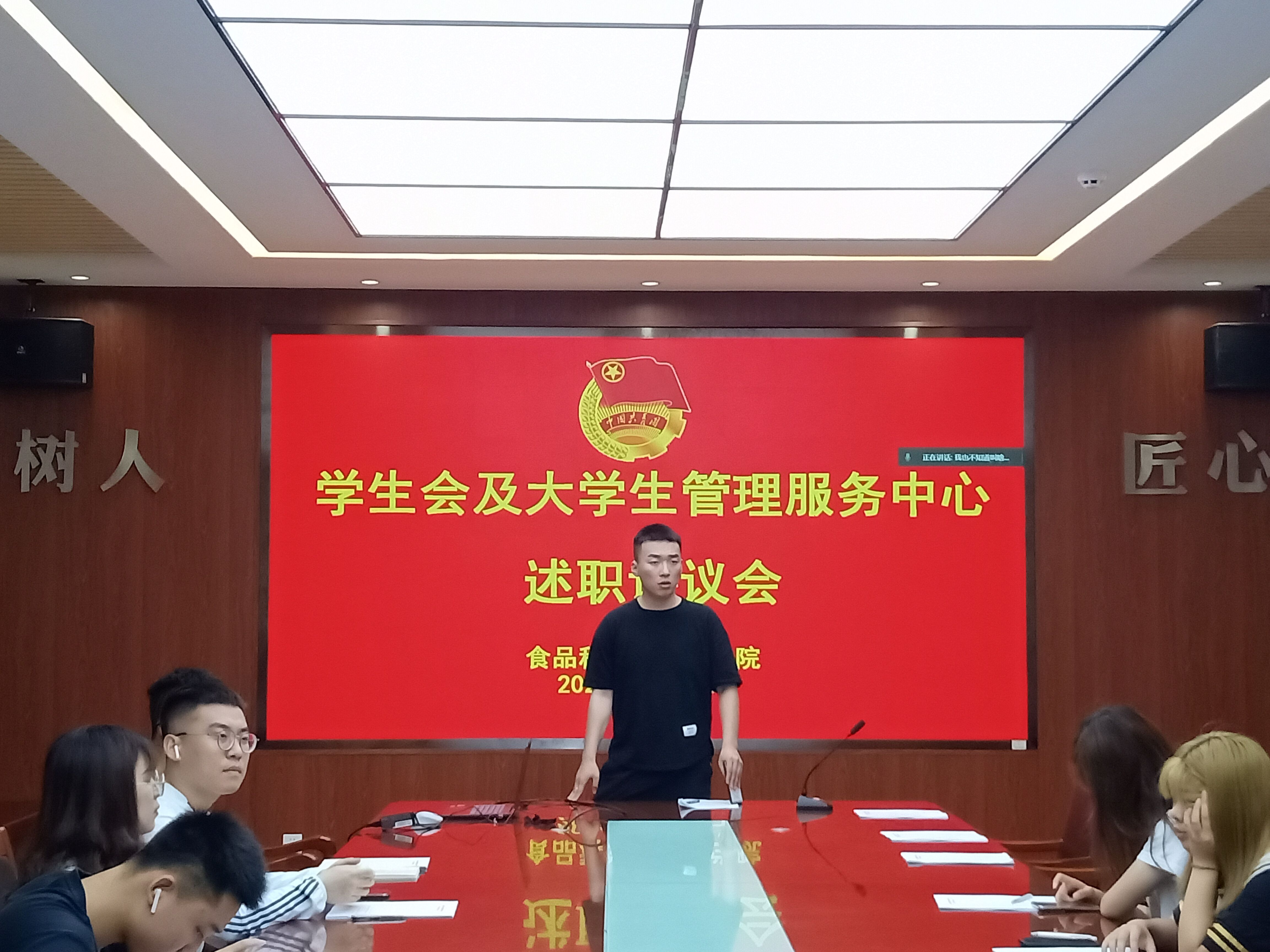 会议由第28届学生会和第二届大学生管理服务中心全体学生干部依次进行述职。学院2019级、2020级各班推选一名学生代表参与评议。各学生干部在述职报告中对自己部门在本年度的工作开展情况进行了详细的总结,并根据取得的成果进行评价,对一些不足之处进行剖析,分析状况发生的原因,提出了新的建议。其中,学院学生会主席孙伟哲从学生会工作总结、个人工作总结、工作反思与建议三个方面进行了述职报告,提出了自己任职期间对学生会工作的认识。他表示在学习工作中与同学们团结协作的过程永远不会忘记,同时对下一届学生会寄予厚望,希望下一届学生会继续发扬食品精神,将工作真正落到实处。