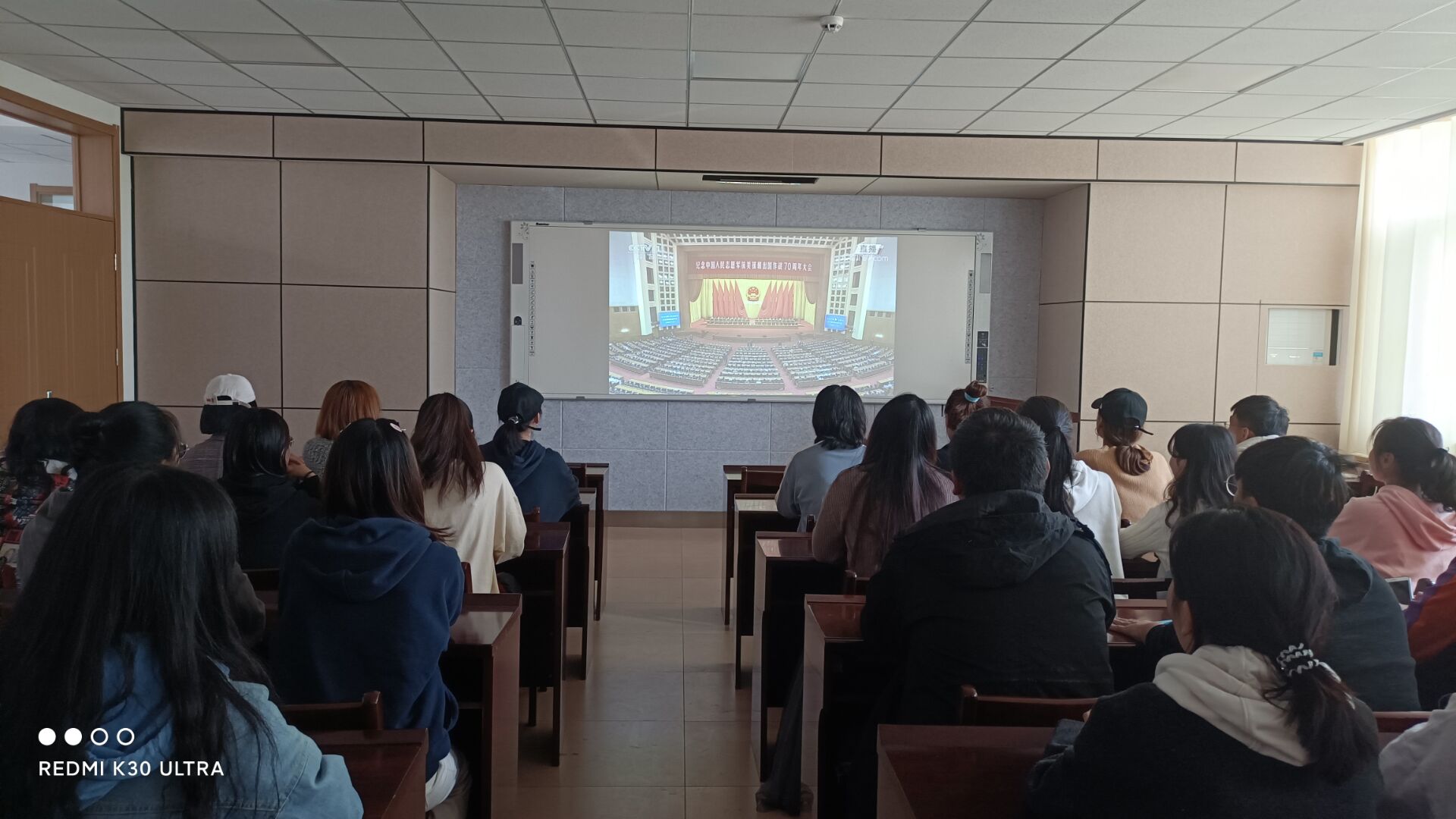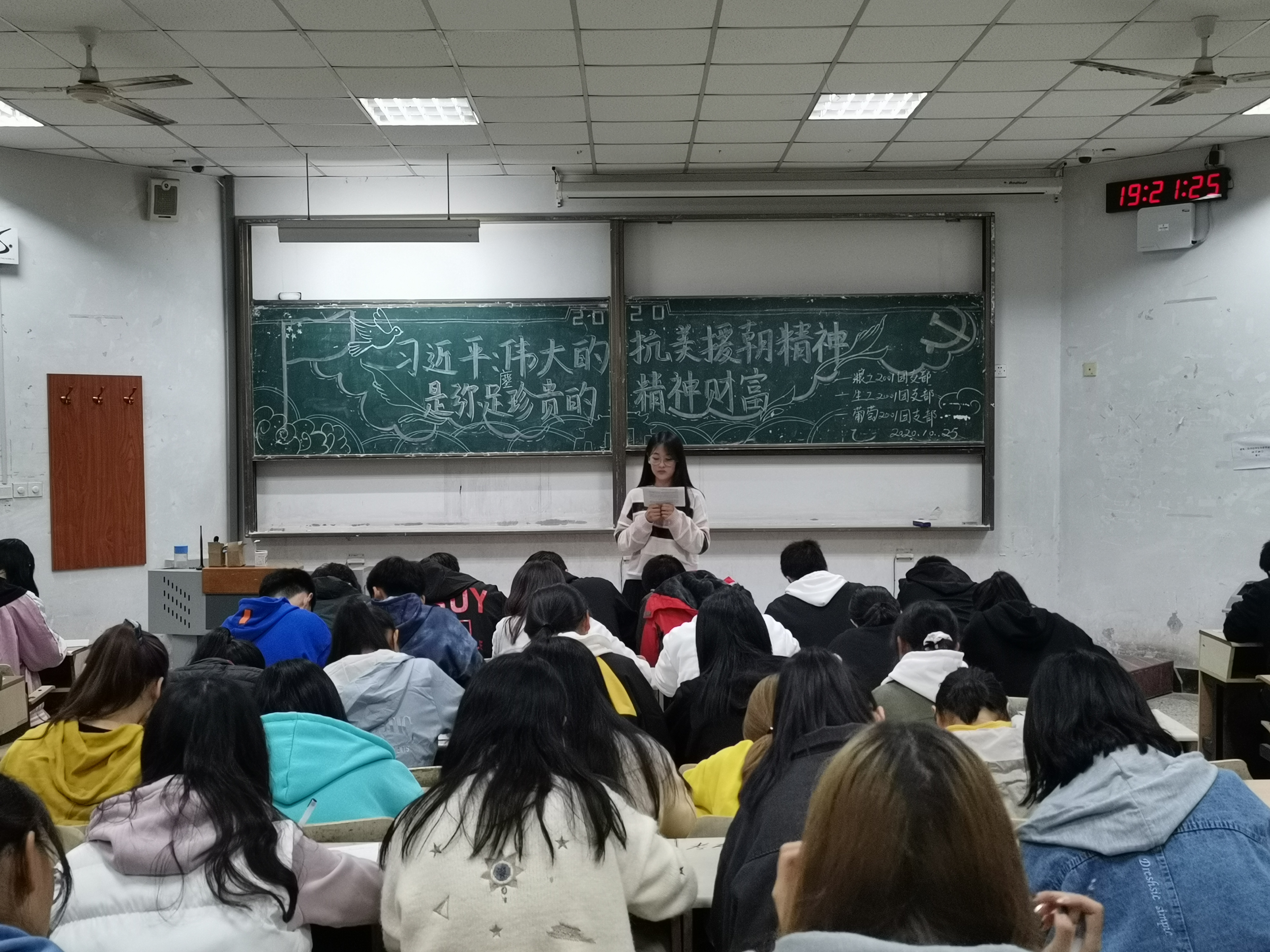 10月25日,食品学院于教学楼开展“习近平在纪念中国人民志愿军抗美援朝出国作战70周年大会上的讲话”主题政治学习。学院2019、2020级全体学生参与学习。食品科学与工程1902班主讲人对本次政治学习进行概括总结,作为当代青年,我们要更加紧密地团结在以习近平同志为核心的党中央周围,弘扬伟大的抗美援朝精神,雄赳赳、气昂昂,敢于斗争、善于斗争,知难而进、坚韧向前,承担起实现中华民族伟大复兴的中国梦的责任,为全面建设社会主义现代化国家贡献出自己的一份力量。