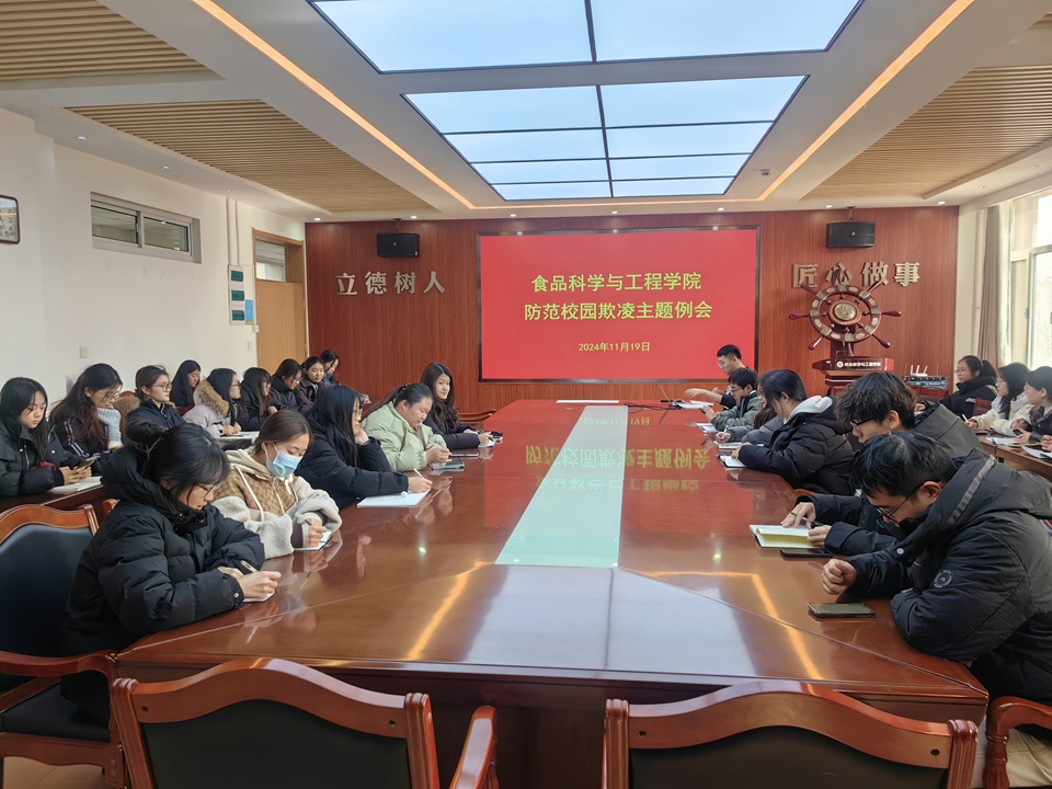 为坚决遏制学生欺凌和暴力事件发生,切实保护学生身心健康,努力把校园打造成最安全、最阳光的地方,11月19日,食品学院召开防范校园欺凌主题例会。
