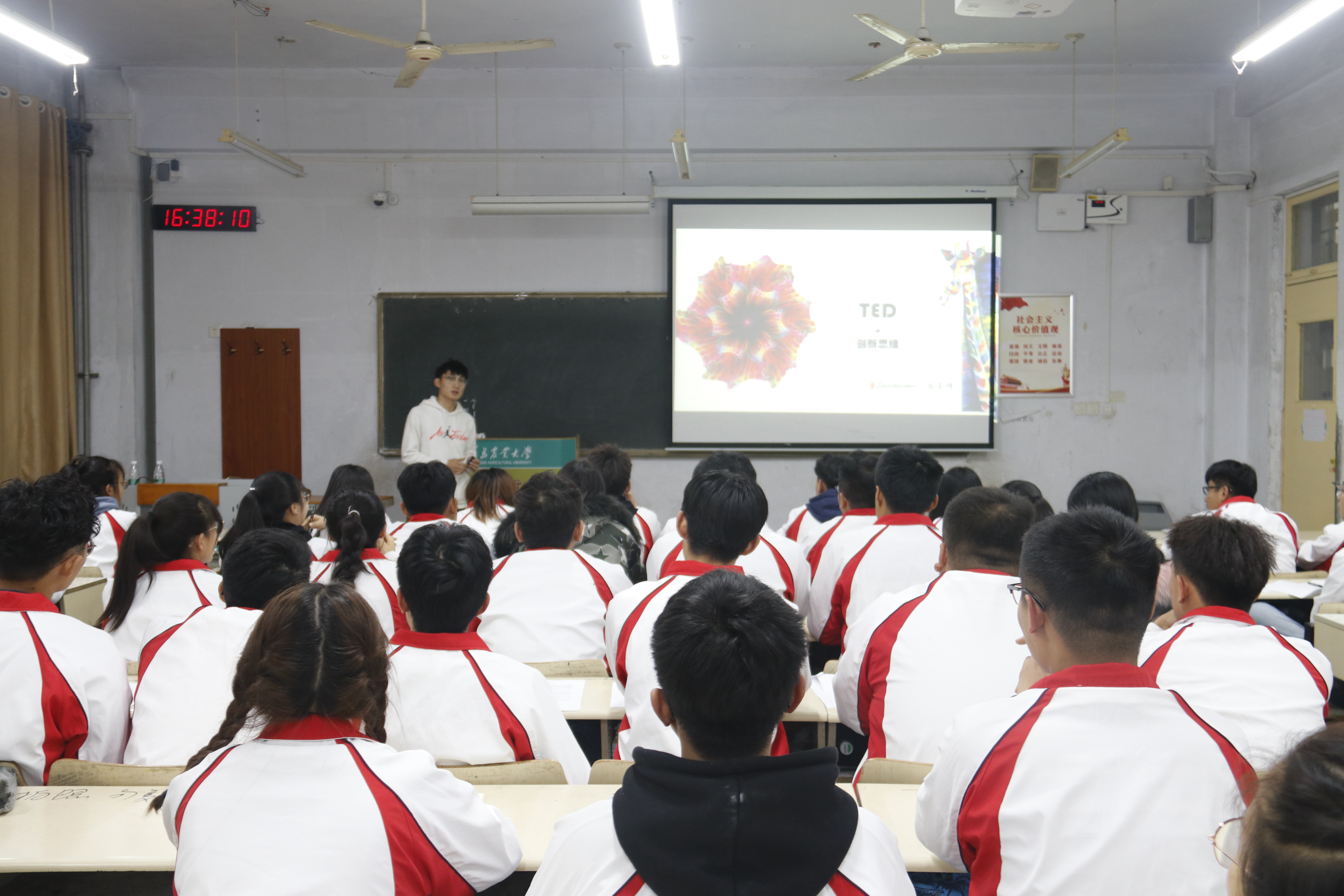 三位主讲人分别从社会实践板块,TED演讲板块与创新板块三个板块进行讲解,演讲内容结构清晰,主讲人声音响亮。于期泰、冉昊杰以其个人社会实践经历深入浅出地讲解了社会实践活动的原因、定义、基本步骤以及社会实践的意义。于期泰认为:大学生在社会实践时应该理清工作思路,结合自身实际确定社会实践主题,合理运用资源,在社会实践的过程中,要制定详细的活动计划,注重团队合作,发现问题要及时进行总结归纳,积极地去解决问题。高圣琦讲述了TED+创新思维,从TED演讲的定义、特点及注意事项三个方面进行了讲解,语言精炼,内容丰富,生动形象地让同学们感受到了TED演讲的形式特点及其语言魅力。他讲到了创新的重要性,并向青马成员们介绍了TED演讲的选题指南、演讲风格及常用开场方式。TED是technology、entertainment、design的缩写,为国际上通用的一种演讲方式。