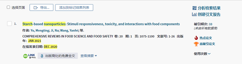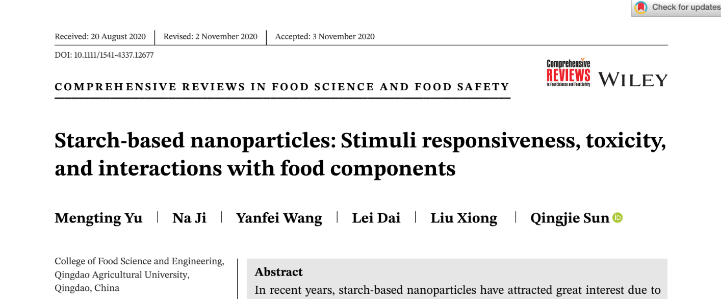 近日,beat365在线体育官网孙庆杰教授团队在食品顶级期刊Comprehensive Reviews in Food Science and Food Safety, 2021, 20:1075–1100(中科院大类1区Top期刊,IF=9.912)上发表题为“Starch-based nanoparticles: stimuli responsiveness, toxicity, and interactions with food components”的综述性论文。根据Web of Science统计,该论文被引33次,成为ESI高被引论文和Top 0.1%热点论文。青岛农业大学是唯一单位和通讯单位,食品学院孙庆杰教授为通讯作者,青岛农业大学2018级研究生于萌婷为论文第一作者。