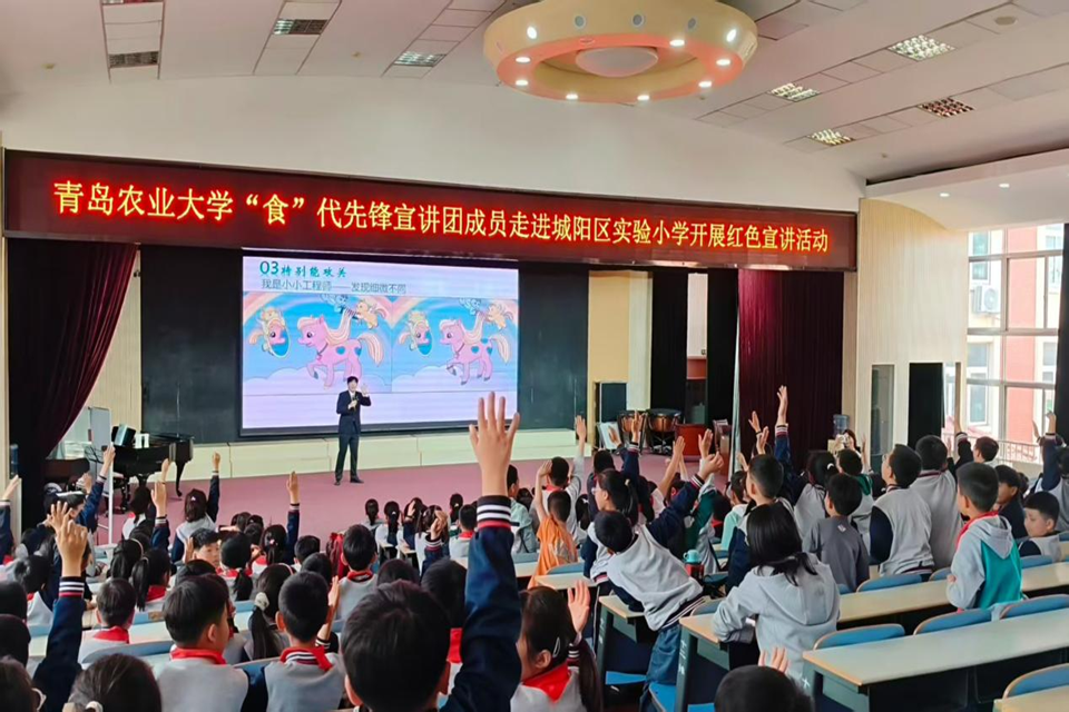 为深入学习贯彻党的创新理论,传承红色基因,推动大中小学思想政治教育一体化建设走深走实,引导青少年厚植爱国情怀、落实立德树人根本任务,4月14日,beat365在线体育官网“食”代先锋理论宣讲团走进城阳区实验小学,面向三年级全体少先队员开展“中国共产党人精神谱系”微党课宣讲活动。