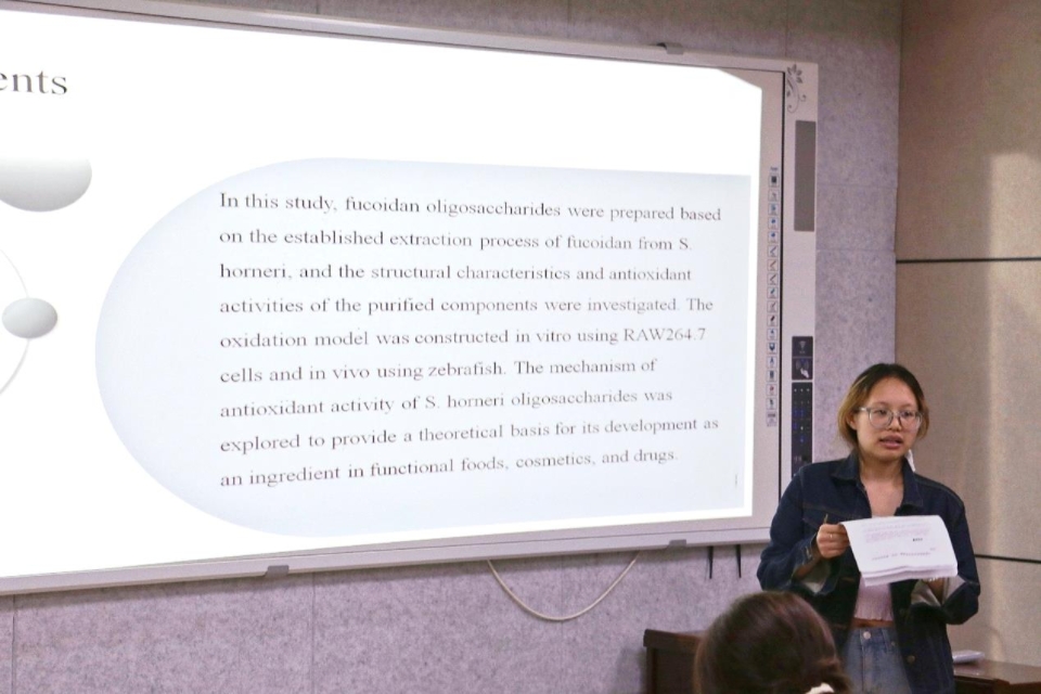 张洋洋在报告中首先介绍了研究的背景与目标。马尾藻作为一种可食用褐藻,富含岩藻多糖,具有增强免疫力、抗氧化等多种生物活性,但因其低溶解度和高分子量限制了开发应用。基于此背景,该研究通过降解和纯化制备岩藻多糖低聚糖,探究其结构特征与抗氧化活性,为其在食品、化妆品、制药等领域的应用提供了理论依据。