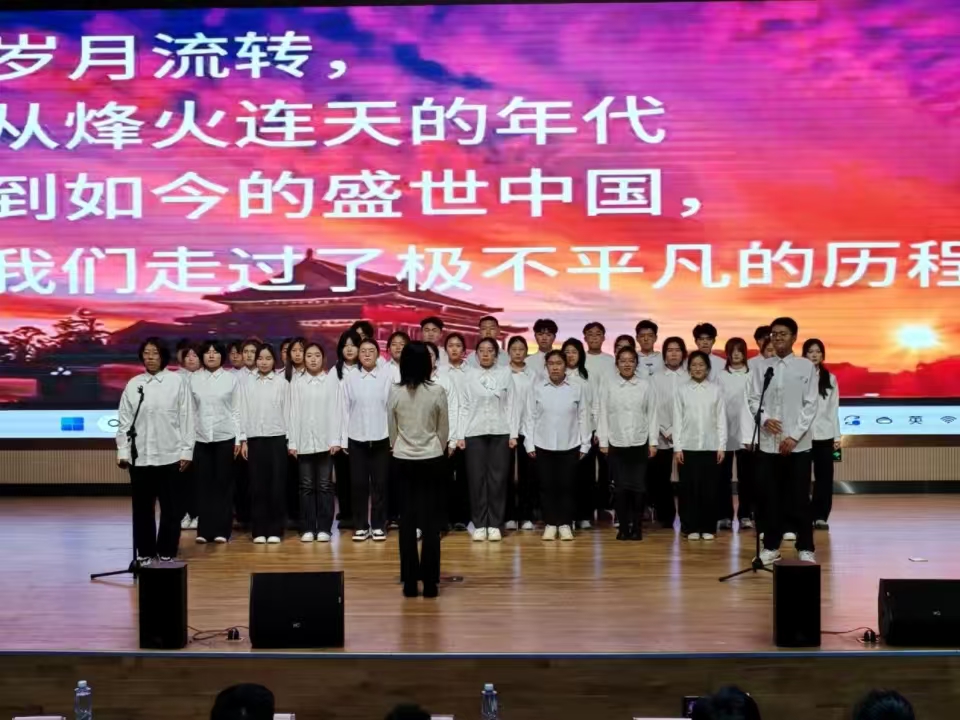 比赛现场,7支参赛队伍着装整齐,依次登台演唱《我和我的祖国》《少年中国说》等经典爱国歌曲。以旋律串联起一条壮丽长河,借深情演唱,感慨先辈奋斗之不易,展现青年继往开来之壮志。