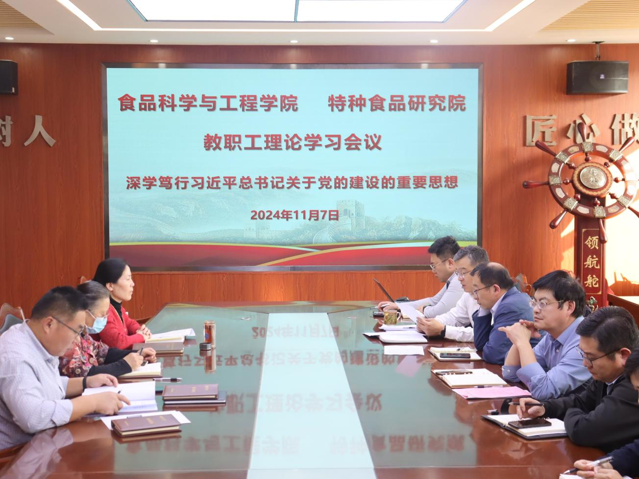 11月7日,beat365在线体育官网、特种食品研究院召开教职工政治理论学习会议,深学笃行习近平总书记关于党的建设的重要思想,全体教职工参加会议,会议由学院党委书记车广杰主持。