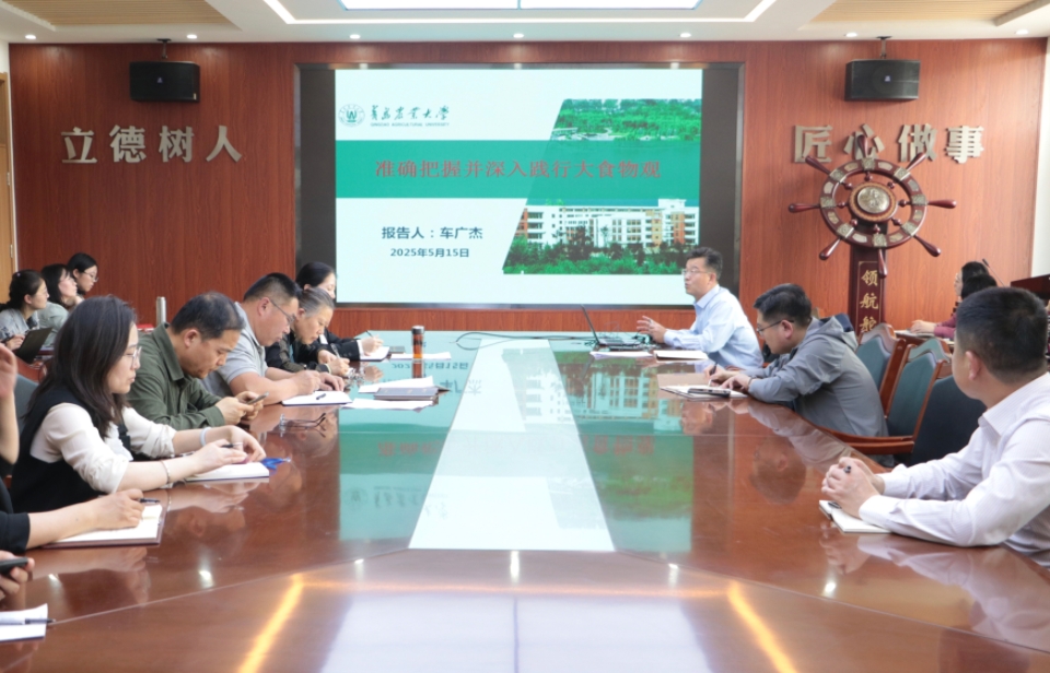 5月15日,beat365在线体育官网召开大食物观专题学习会议,深入学习贯彻习近平总书记关于大食物观的重要论述,学院党委书记车广杰以“准确把握并深入践行大食物观”为题作辅导报告,全体教职工参加学习会议。
