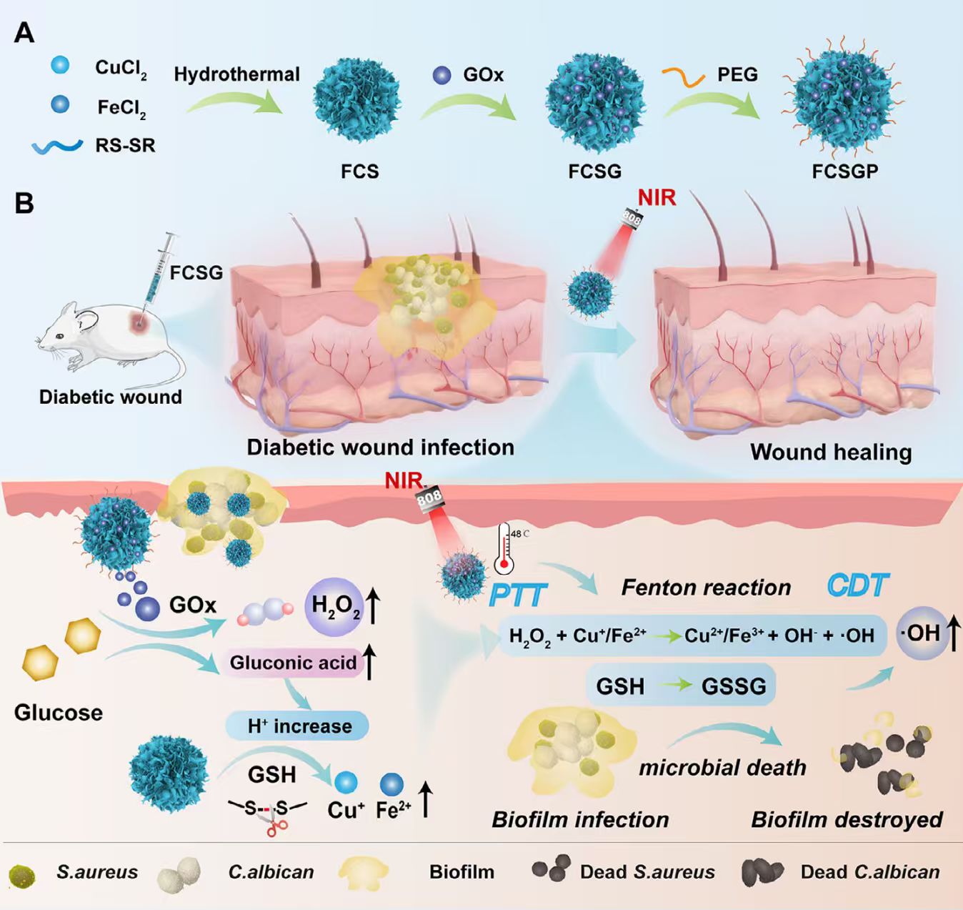 近日,beat365在线体育官网山东省杰青谭玉龙教授团队在国际权威期刊《Small》(一区,TOP,IF=12.1)在线发表题为《Glucose-Activated Fe-Cu Dual-Ion Nanozyme Cascade Reactor with Photothermal Enhancement for Antimicrobial Therapy in Diabetic Wound Healing》的文章,设计了一种具有高抗菌效率和载药能力的葡萄糖激活纳米反应器(FCSGP NPs),以增强对致病微生物及其生物被膜的抑制效果。