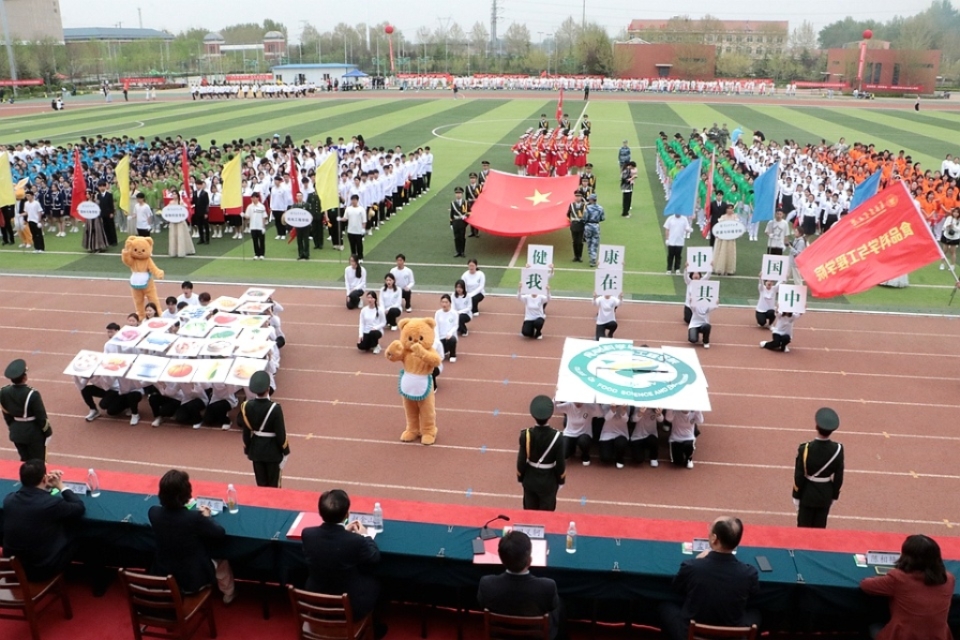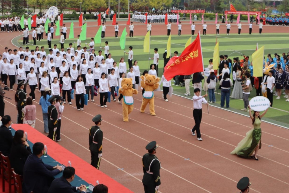 开幕式上,食品学院方阵步伐矫健、气势昂扬。同学们手持精心制作的道具,色彩鲜艳夺目,与“食为人先、品行天下,健康中国、我在其中”的响亮口号声交织在一起,彰显出蓬勃朝气。他们以整齐划一的队列变换,巧妙组成平衡膳食宝塔,展现出学院的独特风格。