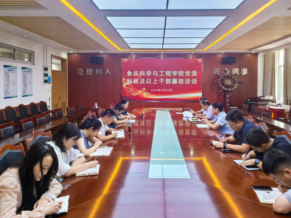 廉政谈话是加强党内监督的一项重要制度,是学院党委履行全面从严治党主体责任的重要举措。食品学院党委将以实际行动抓好班子、带好队伍、做好表率,强化对全院干部师生的监督管理,提高党性修养、砥砺政治品格、锤炼过硬本领,以忠诚干净担当的实际行动,营造风清气正的干事氛围,为学院各项事业高质量发展贡献力量。