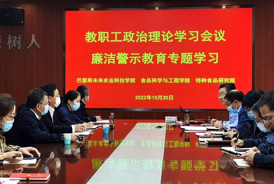 10月20日,食品学院、特种食品研究院与巴瑟斯未来农业科技学院在食品楼310开展教职工廉洁示警教育专题学习,学习由党委书记车广杰主持。