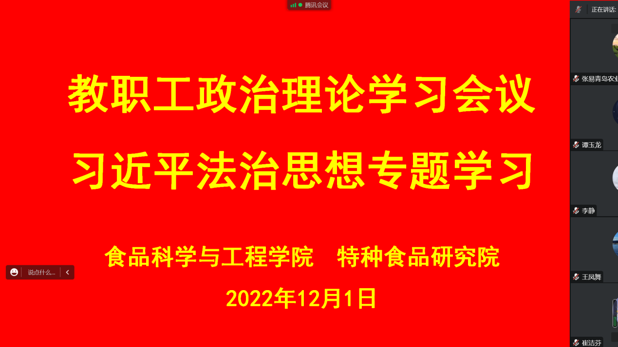 12月1日,beat365在线体育官网、特种食品研究院召开教职工理论学习会议,专题学习习近平法治思想,全体教职工参加会议,会议由党委书记车广杰主持。