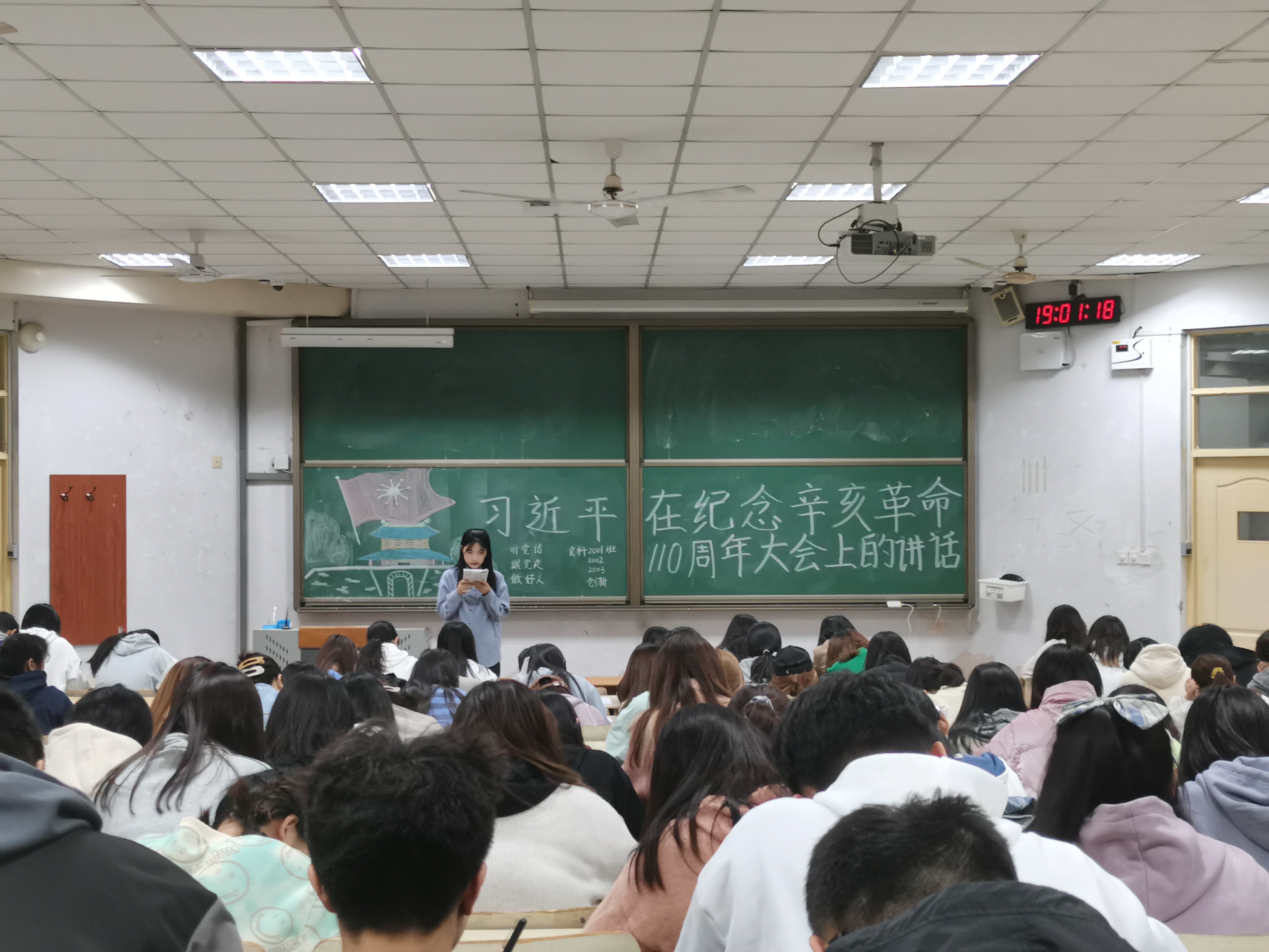 在本次政治学习过程中,各班主讲人以习近平总书记的讲话内容为核心,深入浅出地向同学们介绍了110年前以孙中山先生为代表的革命党人发动的震惊世界的辛亥革命。食科创新班主讲人孟淑详细介绍了辛亥革命110年来的历史意义:辛亥革命推翻了清朝政府,结束了在中国延续几千年的君主专制制度,这是中国人民和中国先进分子为实现民族独立、人民解放进行的一次伟大而艰辛的探索。同时启示呼吁同学们:“我们新时代的社会主义青年要铭记历史,牢记历史,学习历史,要实现中华民族伟大复兴,必须依靠中国人民自己的英勇奋斗,吾辈青年必然要以国家复兴为己任,砥砺前行。”
