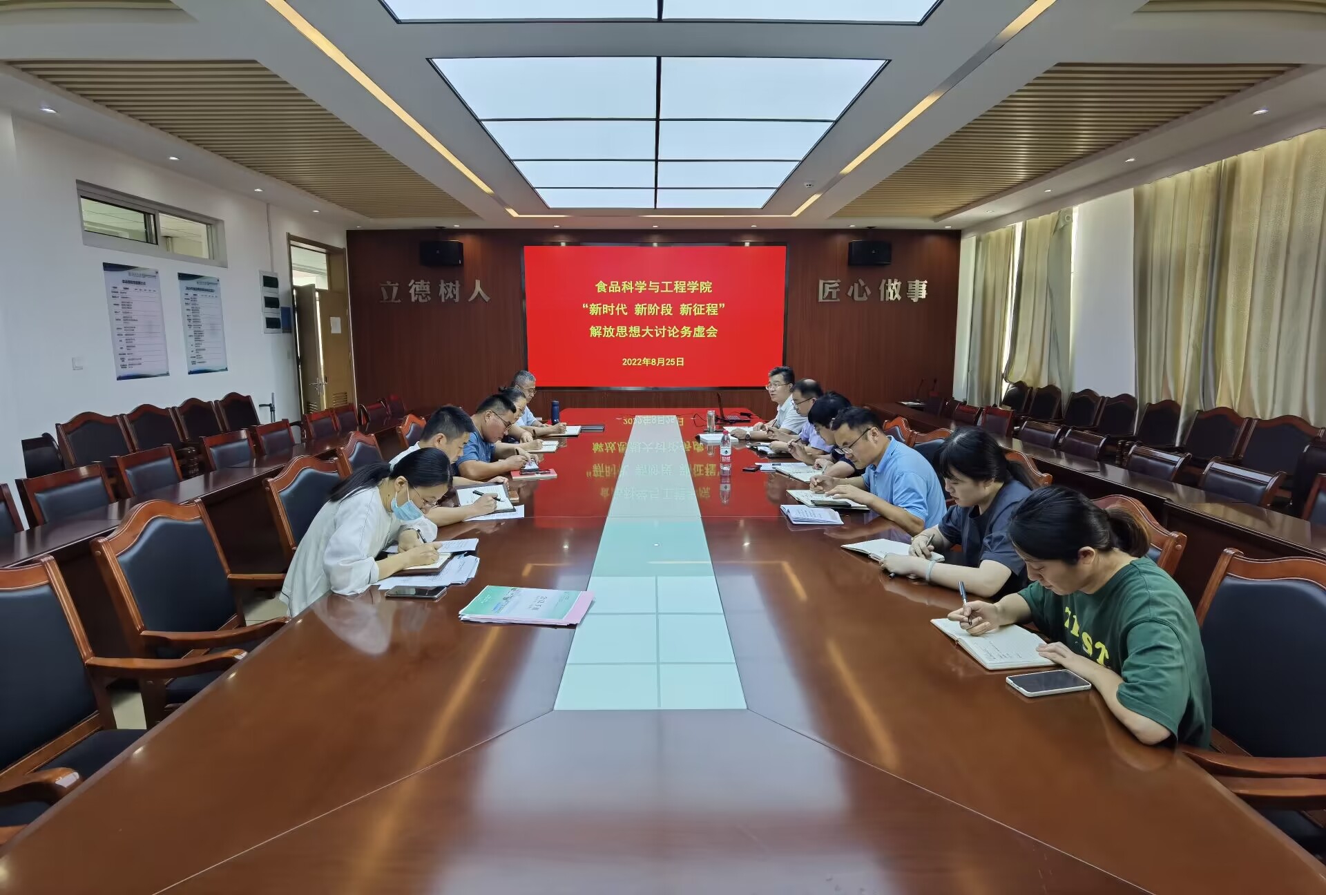 8月25日,学院召开党政领导班子、科级以上干部解放思想大讨论务虚会,班子成员依次作了发言,全面对照校党委《关于开展“新时代 新阶段 新征程”解放思想大讨论活动》通知要求,以推动学校高质量发展为目的,重点围绕基层党组织建设、学科建设、师资队伍建设、人才培养、科技创新、管理服务等方面,联系工作实际,找差距、定目标、拿举措,进一步坚定了发展信心,廓清了思路打法,起到了加压鼓劲奋进的目的。党委书记车广杰在会上指出,学院党政领导干部要切实提高思想认识,增强思想自觉和行动自觉,进一步准确把握大讨论的内涵要求和目标任务,强化当龙头的责任意识、作表率的进取意识、开新局的创新意识,不折不扣将学校党委各项要求抓实抓好,把大讨论的成果转化为干事创业的强劲动力。以此次大讨论为契机,推动学院各项工作提质增效、跨越提升,以实际行动迎接党的二十大胜利召开。