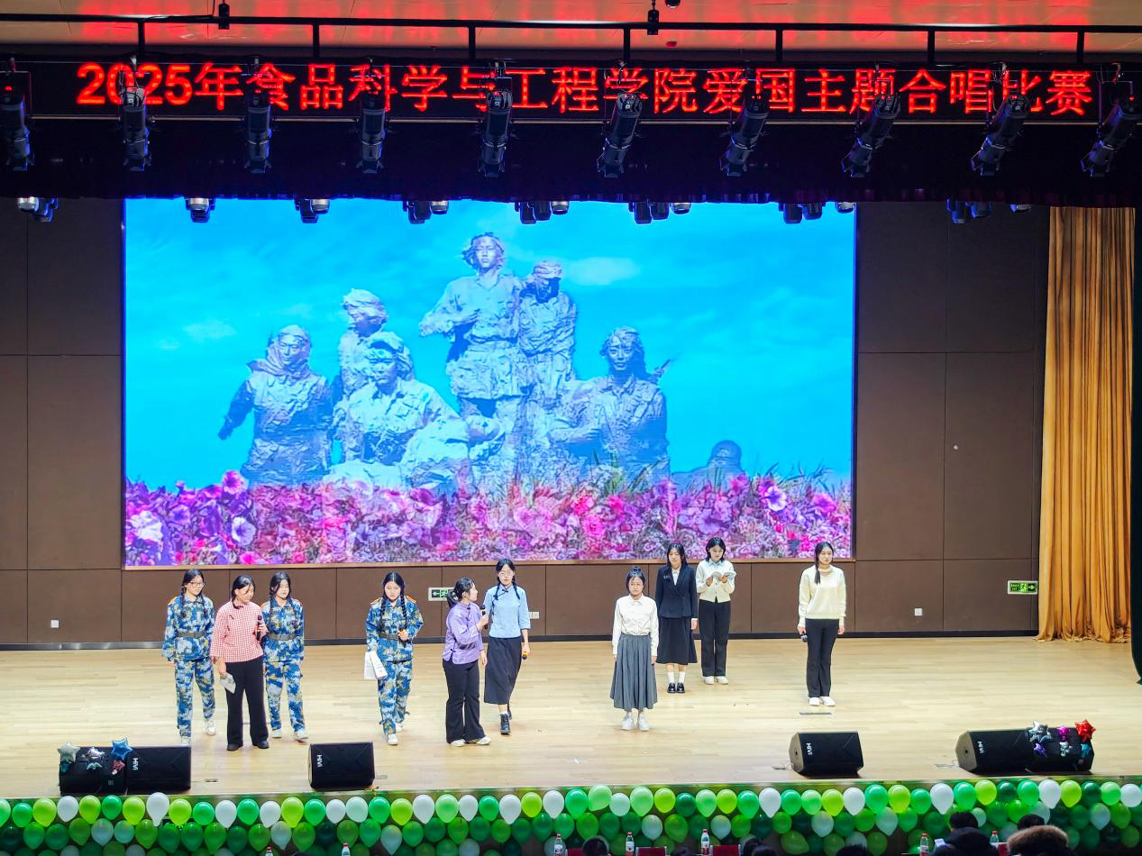 赛前,全体师生一同观看红色历史影像资料,重温革命岁月,在沉浸式的学习过程中唤醒红色记忆、凝聚爱国共识。比赛中,各参赛班级着装整齐、精神饱满,以铿锵嘹亮的歌声深情演绎经典红色曲目,展现出食品学子昂扬向上的精神风貌。比赛环节结束后,舞台剧《穿越时间的对话》精彩接续,学生们通过扮演革命先烈与新时代青年,在跨越时空的对话中生动再现烽火岁月的坚定信仰与时代担当。