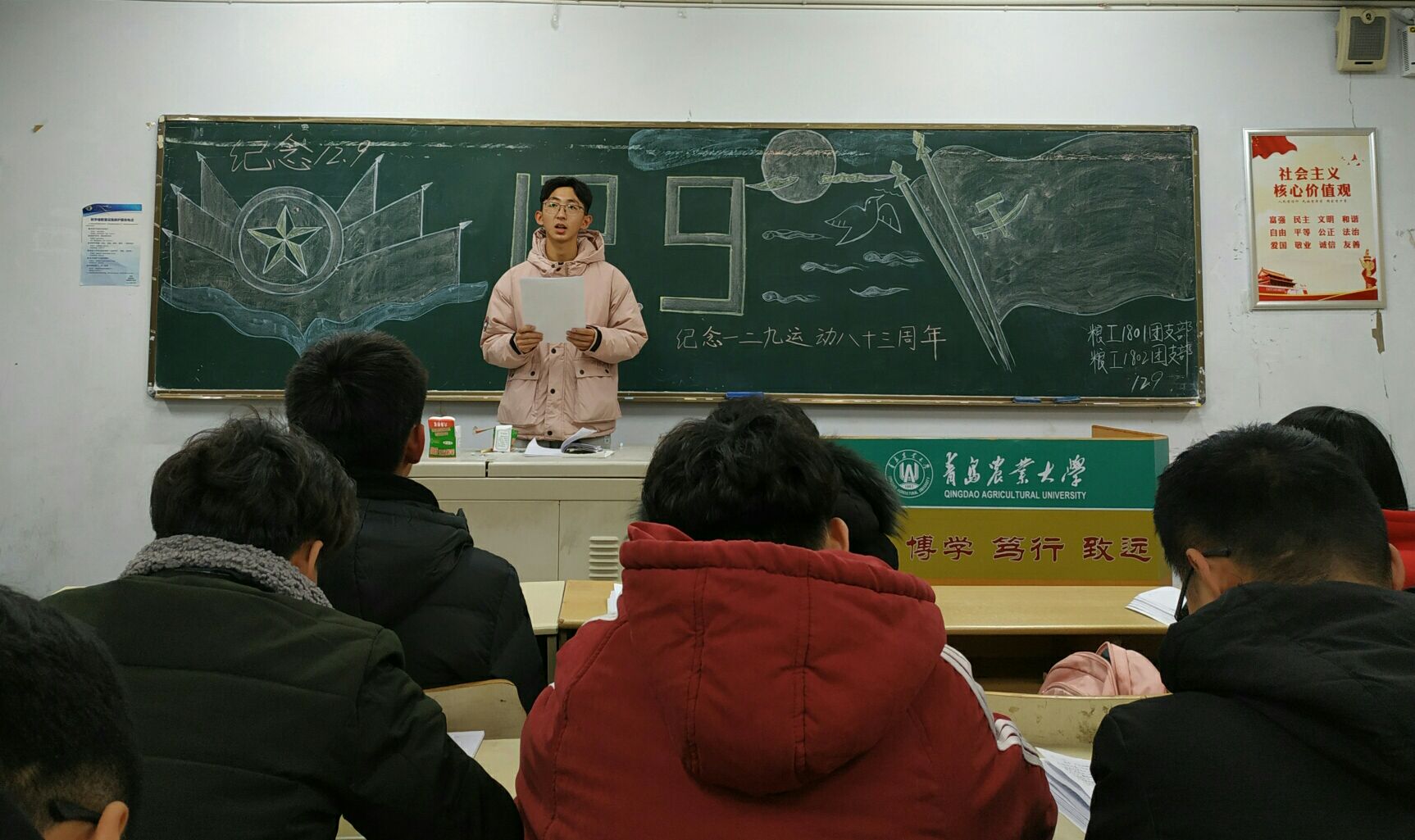 活动中,各班主讲人带领班里同学回忆了一二九运动曲折而富有意义的历史。1935年12月9日,为反对华北自治,反抗日本帝国主义,要求保全领土完整,北平大学生数千人举行了抗日救国示威游行。之后北平学生的爱国行为,得到了全国学生的响应和全国人民的支持,形成了全国人民抗日民主运动的新高潮,推动了抗日民族统一战线的建立。部分班级更是就这段历史展开了激烈的讨论。粮工1801班郑元举说到:“历史不会因时代的变迁而消逝,前辈们的精神更不会因为时光的更迭而磨灭。我们当代青年更应该不忘初心,牢记使命,居安思危,紧跟前辈步伐,为中华民族伟大复兴而努力奋斗,为我们伟大的中国梦而努力奋斗。”