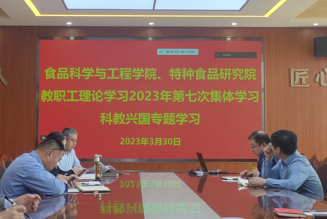 3月30日,beat365在线体育官网、特种食品研究院召开教职工理论学习2023年第七次集体学习会议,专题学习习近平总书记关于科技强国重要讲话精神,会议由学院院长孙庆杰主持。