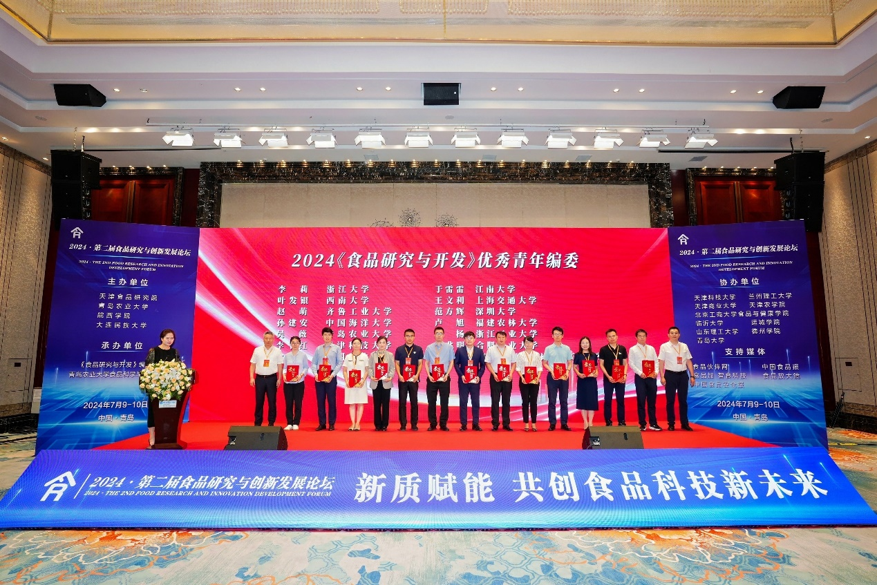 论坛上,天津食品集团党委委员、副总经理毕国生,渤海大学党委副书记刘贺为《食品研究与开发》优秀青年编委颁发荣誉证书,皖西学院党委副书记、校长黄友锐,中国海洋大学教授牟海津为12位研究生颁发“2024•第二届食品研究与创新发展论坛”研究生论坛优秀奖。我校吴薇教授和研究生周玲玲分别获奖。