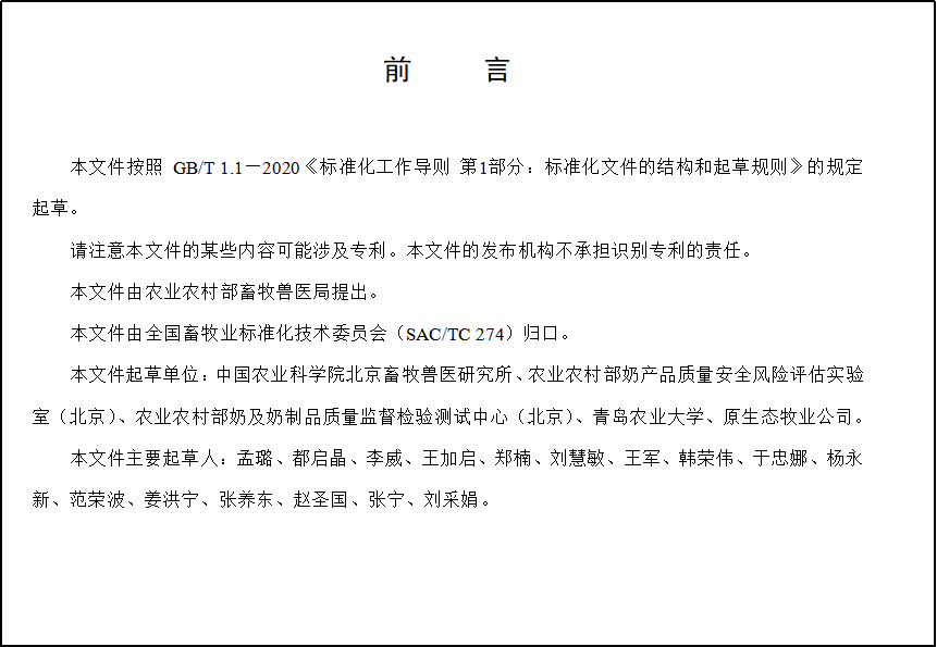 该标准由由中国农业科学院北京畜牧兽医研究所奶业创新团队、农业农村部奶产品质量安全风险评估实验室(北京)、农业农村部奶及奶制品质量监督检验测试中心(北京)、青岛农业大学、原生态牧业公司共同制定。