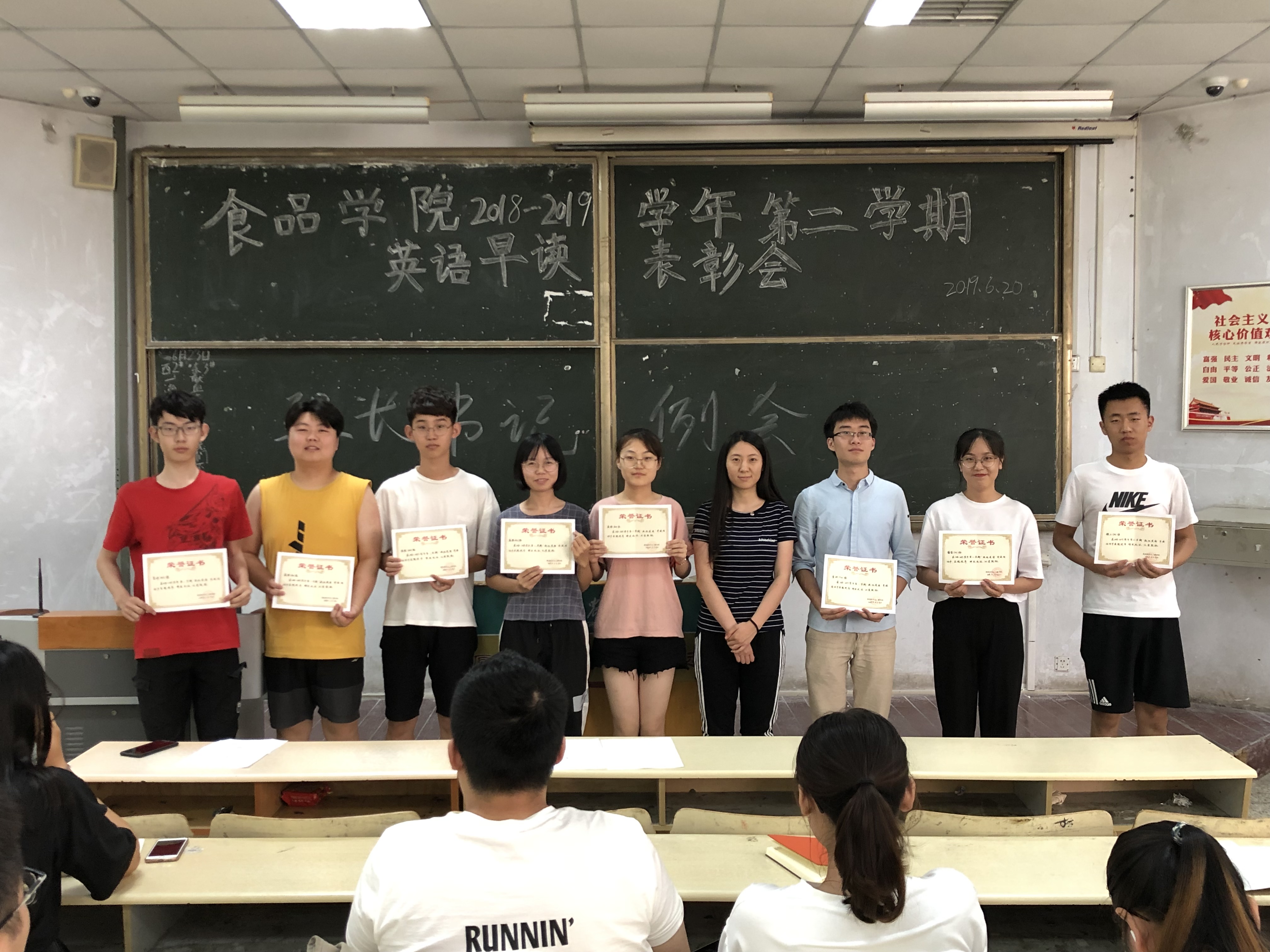 英语早读活动结束后,学院给表现优异的班级进行表彰。江巧宁为粮工1701班、质检1804班、葡萄1701班等九个获奖班级颁发证书并合影留念。