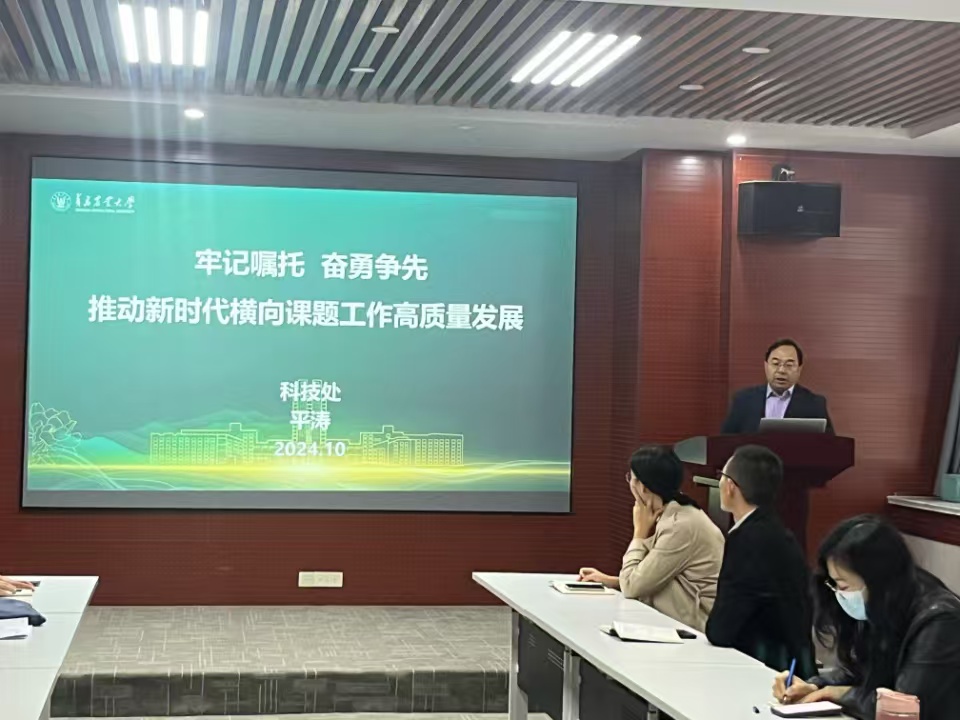 为深入贯彻学校科研政策,扎实推进横向科研项目立项和成果转移转化工作,10月22日,特种食品研究院召开横向科研项目工作推进专题会议。会议邀请科技处产业融合办公室主任平涛对学校新修订的相关文件进行解读,研究院全体教师参加会议。