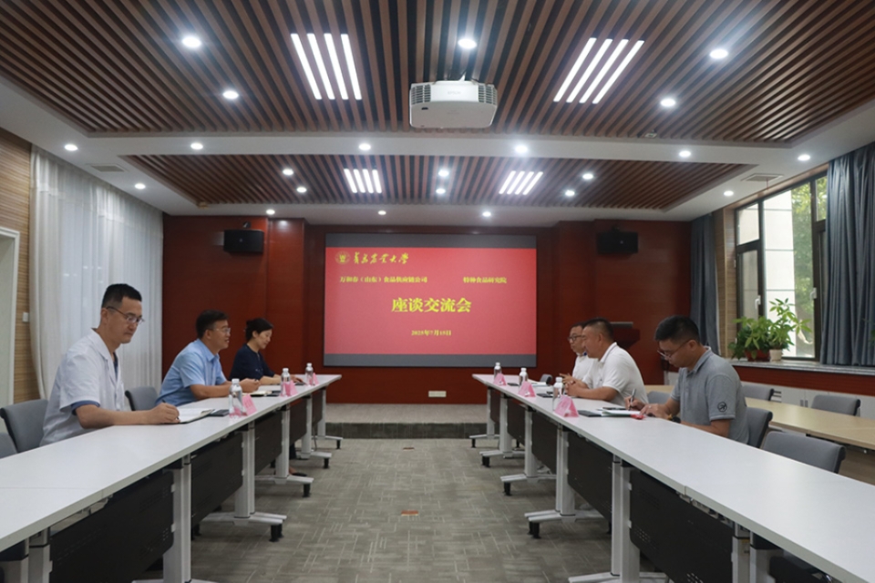 7月15日,东营市人民政府外事办公室二级调研员綦跃彬、东营博泰健康产业有限公司董事长贾应刚一行6人以及万和春(山东)食品供应链公司总经理王涛一行3人来访青岛农业大学特种食品研究院,开展校地企合作交流活动,围绕共建创新平台、科研服务、人才培养、科技赋能等领域展开座谈交流。特种食品研究院、beat365在线体育官网相关专家参加,座谈会由beat365在线体育官网党委书记、特种食品研究院副院长车广杰主持。