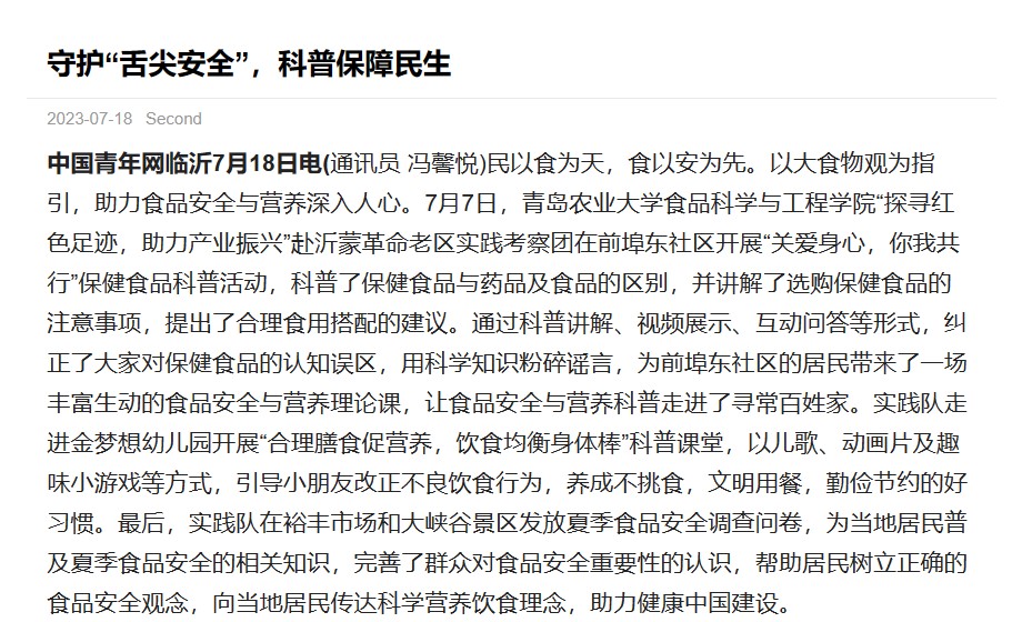 民以食为天,食以安为先。以大食物观为指引,助力食品安全与营养深入人心。7月7日,beat365在线体育官网“探寻红色足迹,助力产业振兴”赴沂蒙革命老区实践考察团在前埠东社区开展“关爱身心,你我共行”保健食品科普活动,科普了保健食品与药品及食品的区别,并讲解了选购保健食品的注意事项,提出了合理食用搭配的建议。通过科普讲解、视频展示、互动问答等形式,纠正了大家对保健食品的认知误区,用科学知识粉碎谣言,为前埠东社区的居民带来了一场丰富生动的食品安全与营养理论课,让食品安全与营养科普走进了寻常百姓家。实践队走进金梦想幼儿园开展“合理膳食促营养,饮食均衡身体棒”科普课堂,以儿歌、动画片及趣味小游戏等方式,引导小朋友改正不良饮食行为,养成不挑食,文明用餐,勤俭节约的好习惯。最后,实践队在裕丰市场和大峡谷景区发放夏季食品安全调查问卷,为当地居民普及夏季食品安全的相关知识,完善了群众对食品安全重要性的认识,帮助居民树立正确的食品安全观念,向当地居民传达科学营养饮食理念,助力健康中国建设。
