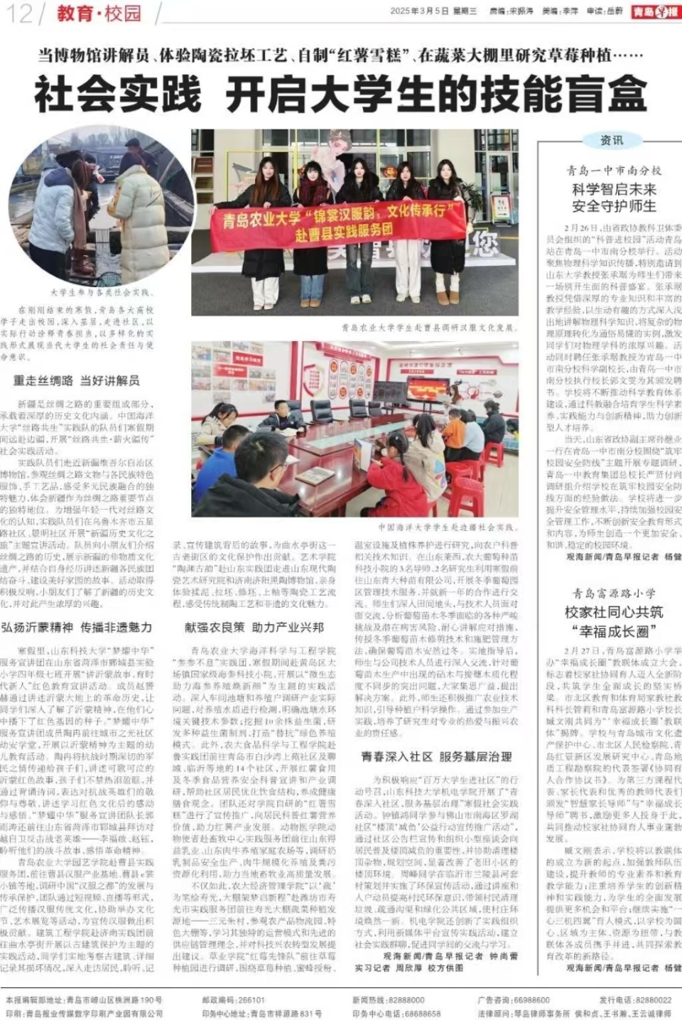 【编者按】3月5日,青岛早报以《社会实践 开启大学生的技能盲盒》为题报道青岛农业大学学子在寒假走出校园,深入基层,走进社区,以实际行动诠释青春担当,以多样化的实践形式展现当代大学生的社会责任与使命意识。