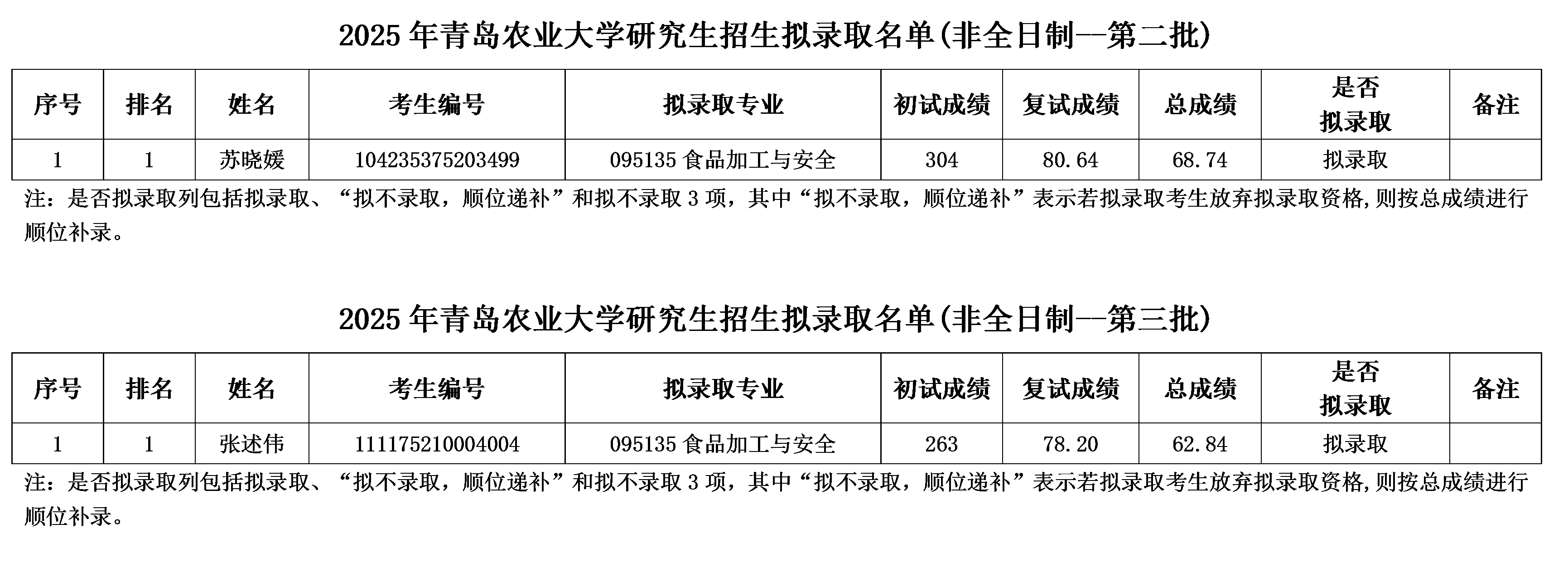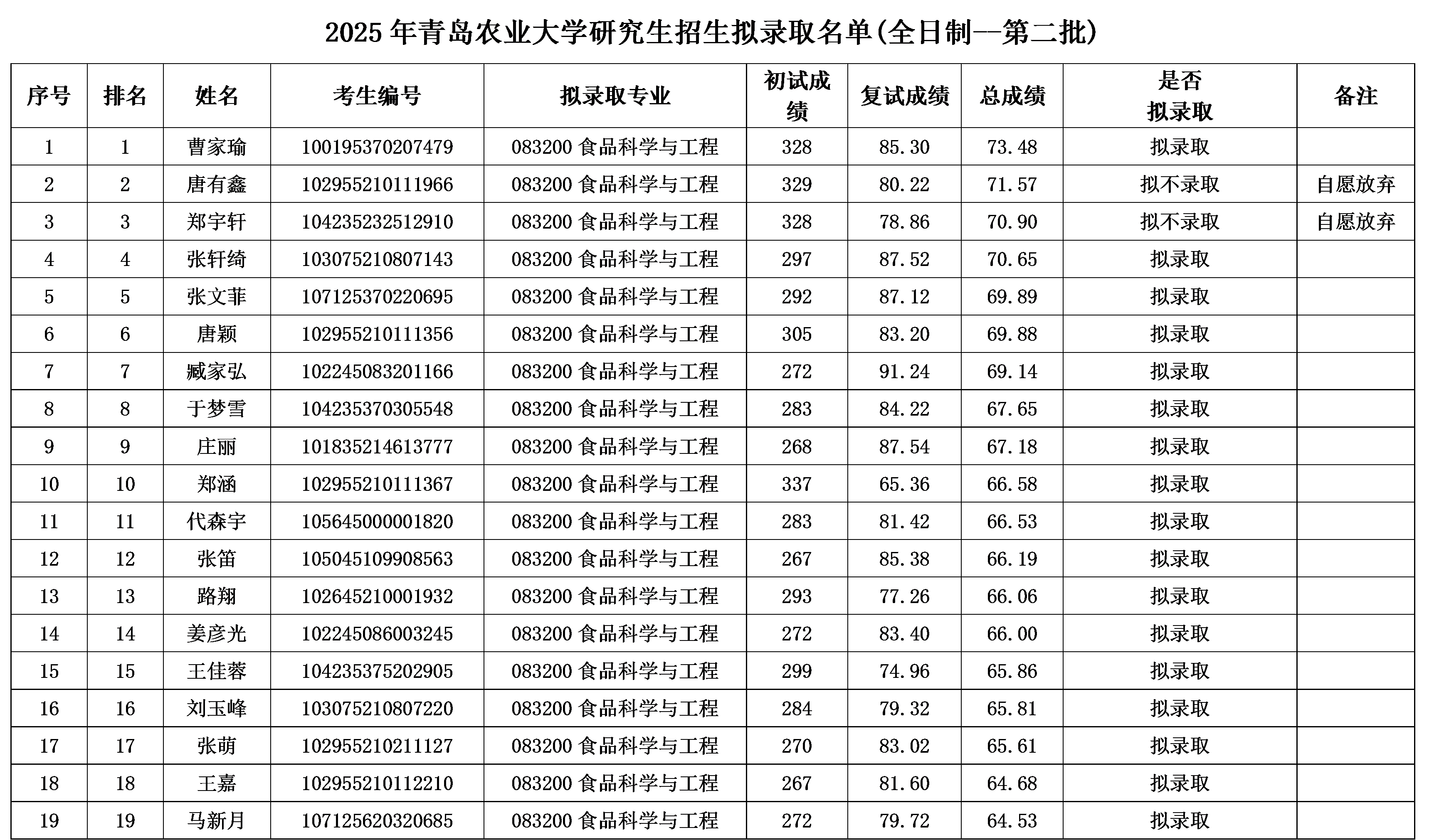 2025年食品学院硕士研究生调剂复试录取名单