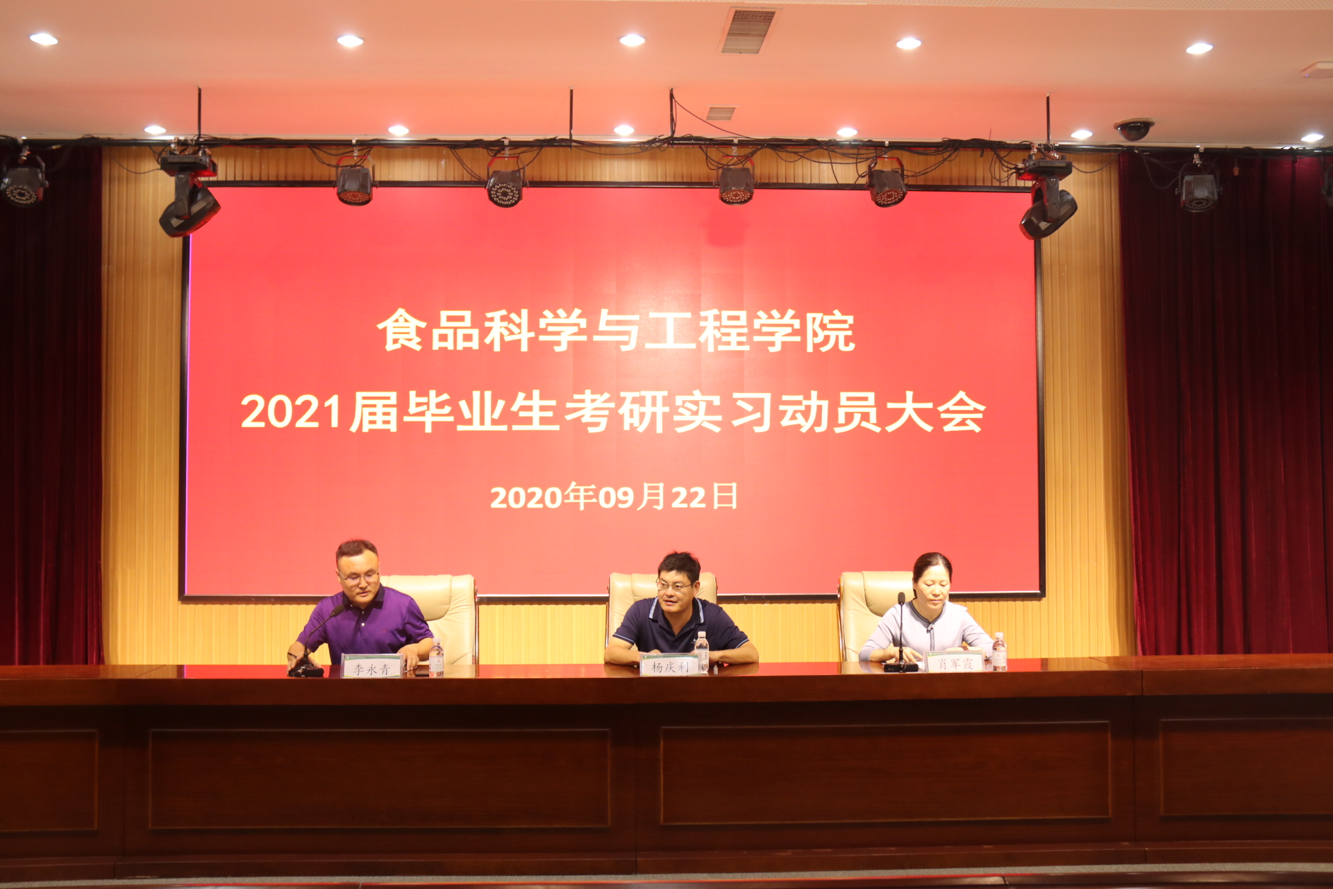 9月22日,beat365在线体育官网于学术会馆举行2020届毕业生考研动员与就业宣讲大会。食品学院副院长杨庆利、肖军霞,团委书记李永青出席会议。学院2017级全体同学参会,会议由李永青主持。