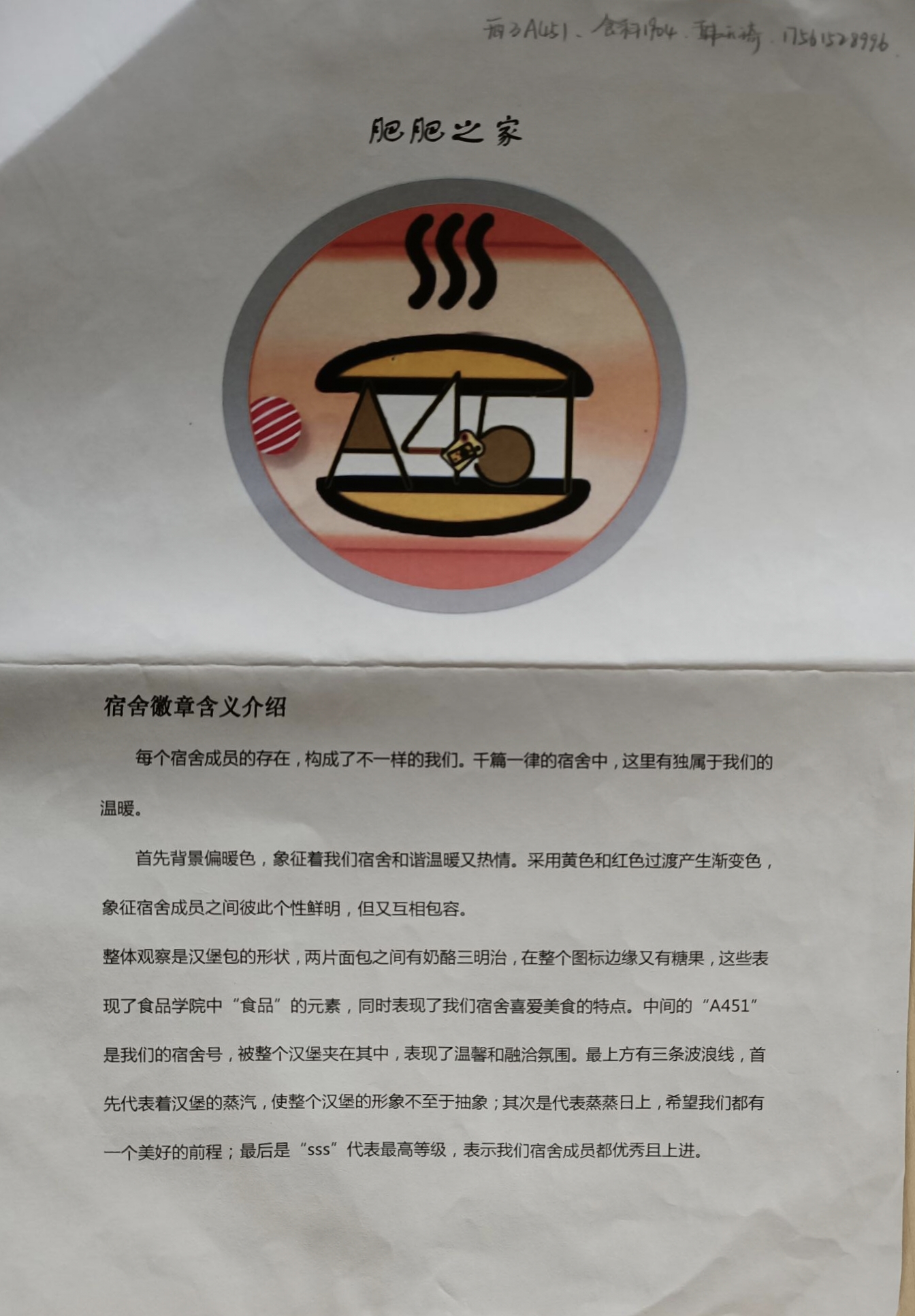 本次比赛要求每一个参赛团队发挥想象,结合实际,通过彩绘或彩印等形式制作一枚舍徽,展现宿舍独特的风采。比赛分为前期原创设计和后期作品评选两个阶段。在前期准备中,各团队同学通过丰富的想象力和宿舍的凝聚力,运用多变的线条与丰富的色彩共同设计了一个个富有特别意义的舍徽,表达了同学们对宿舍生活的热爱。其中,食科2001班以绿叶为底色,展现了宿舍同学蓬勃向上的青春活力,点缀的麦穗和书籍则表现了宿舍同学的团结友爱、共同奋进的精神;食科1904班结合了“食品”专业的特点,以汉堡为主体,生动展现了宿舍同学喜爱美食的特点,偏暖色调的徽章背景,又象征了宿舍的和谐温暖、彼此包容。