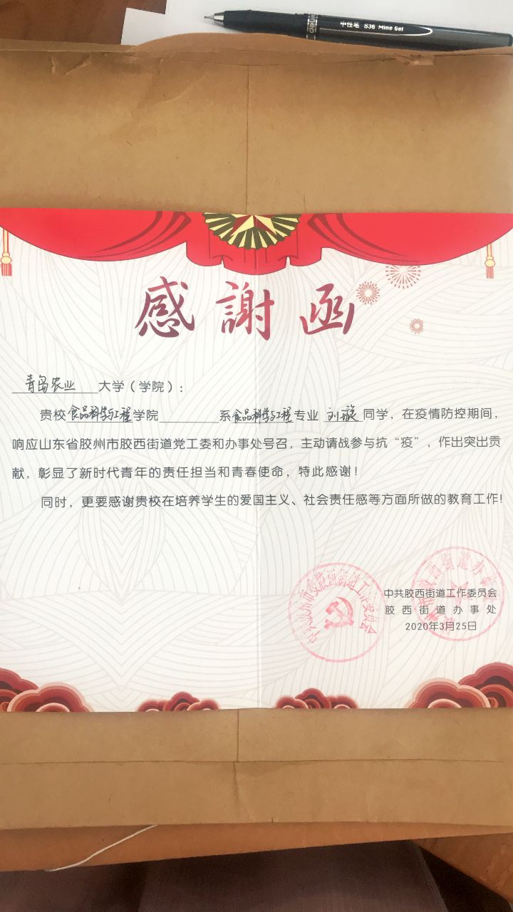 近日,beat365在线体育官网陆续收到参与疫情防控志愿服务同学所在地的表扬信、感谢信、感谢函等文件,对食品学子在此次新冠肺炎疫情防控期间积极参与地区疫情防控工作表示表扬和感谢。
